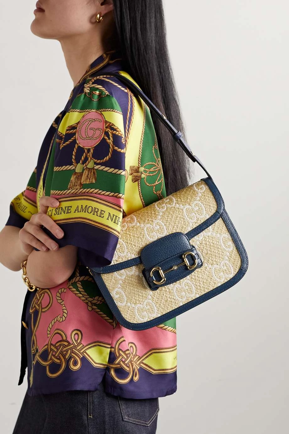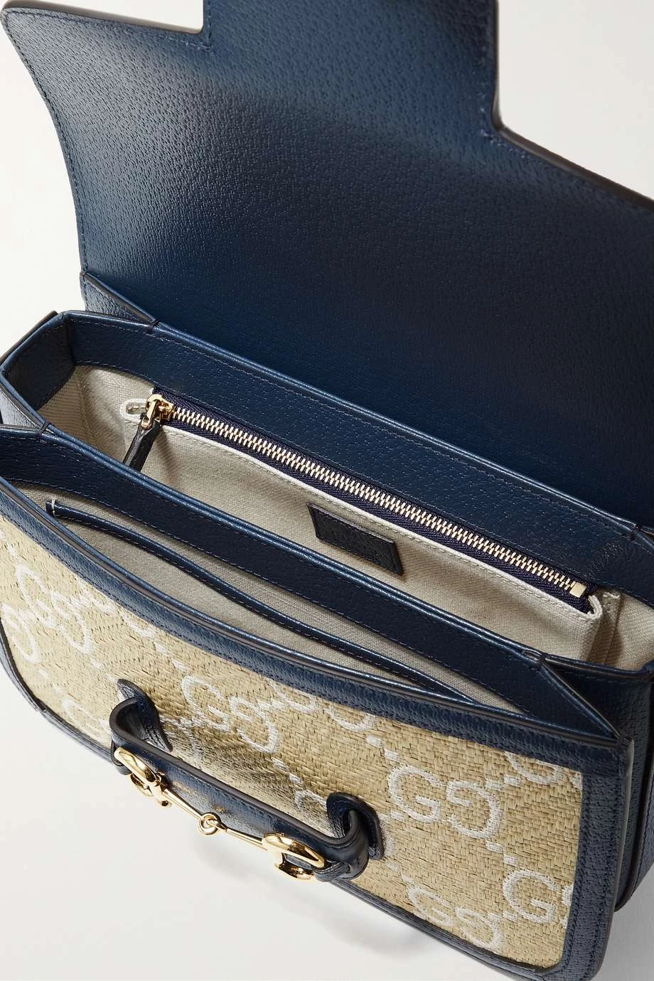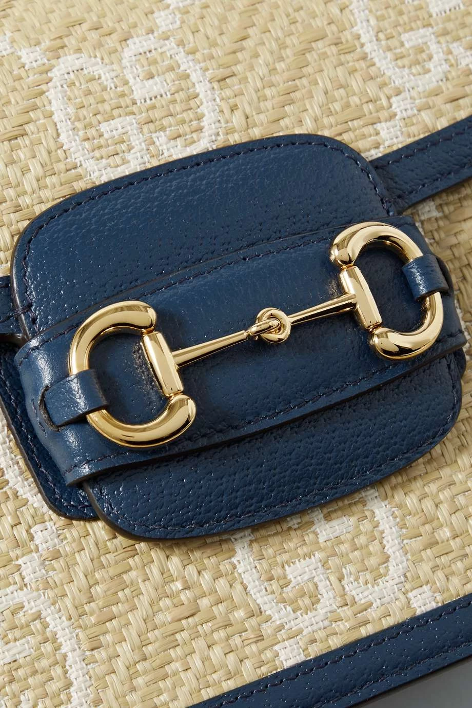 Diese überarbeitete Version der „1955 Horsebit“ Schultertasche von Gucci wurde bereits von Berühmtheiten wie Sienna Miller, Adwoa Aboah und Alexa Chung getragen. Das Accessoire in Form einer Satteltasche wurde in Italien aus Raffiabast mit dem Logomuster der Marke gefertigt und zeigt sich mit dunkelblauen Lederbesätzen. Stimmen Sie Ihren Schmuck auf die goldfarbenen Details im Reitsportstil ab.