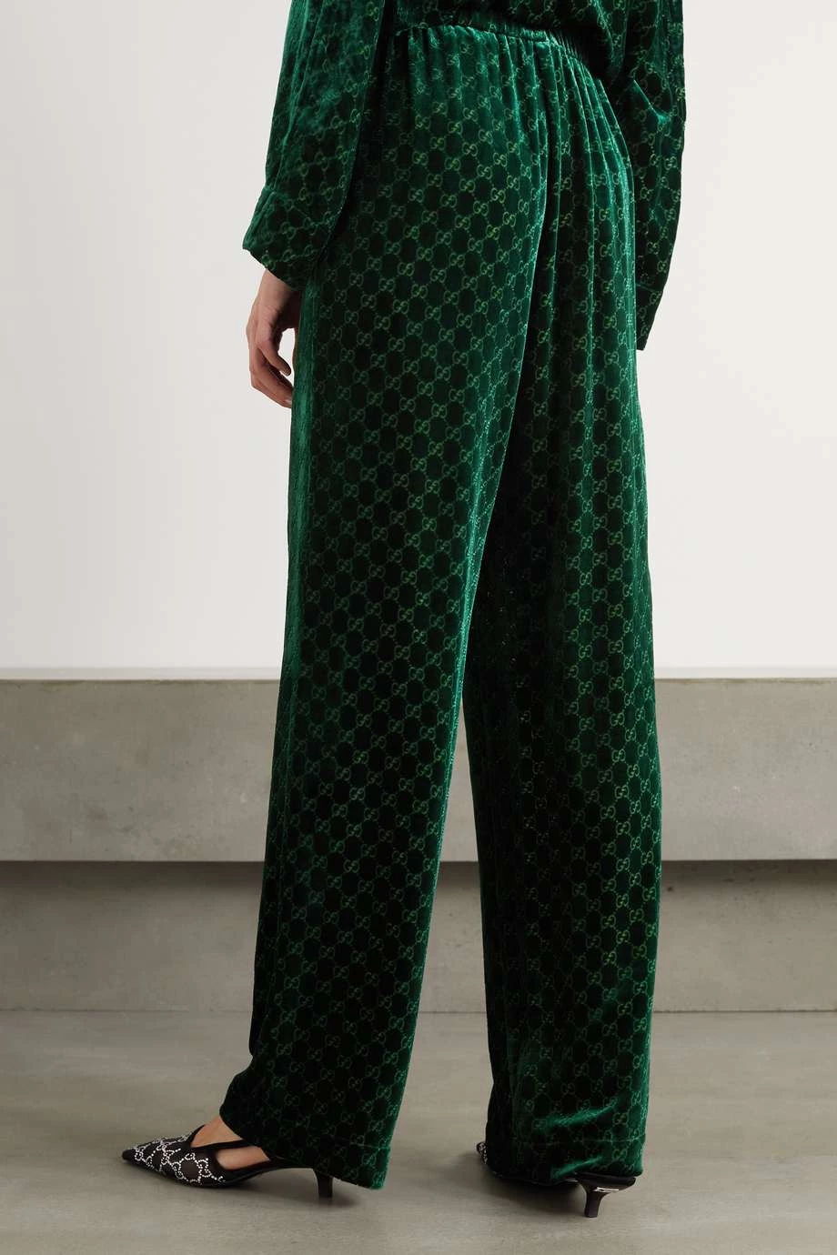 Diese auf dem Resort-Laufsteg 2022 vorgestellte Hose von Gucci besteht aus flauschigem Devoré-Samt mit dem „GG“-Muster aus dem Archiv der Marke. Sie hat einen hoch sitzenden Bund und eine legere, leicht locker geschnittene Passform. Kombinieren Sie das Modell mit dem passenden Hemd und High Heels.
