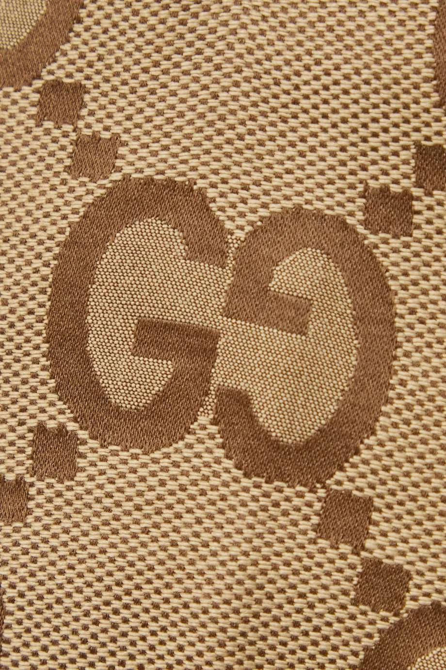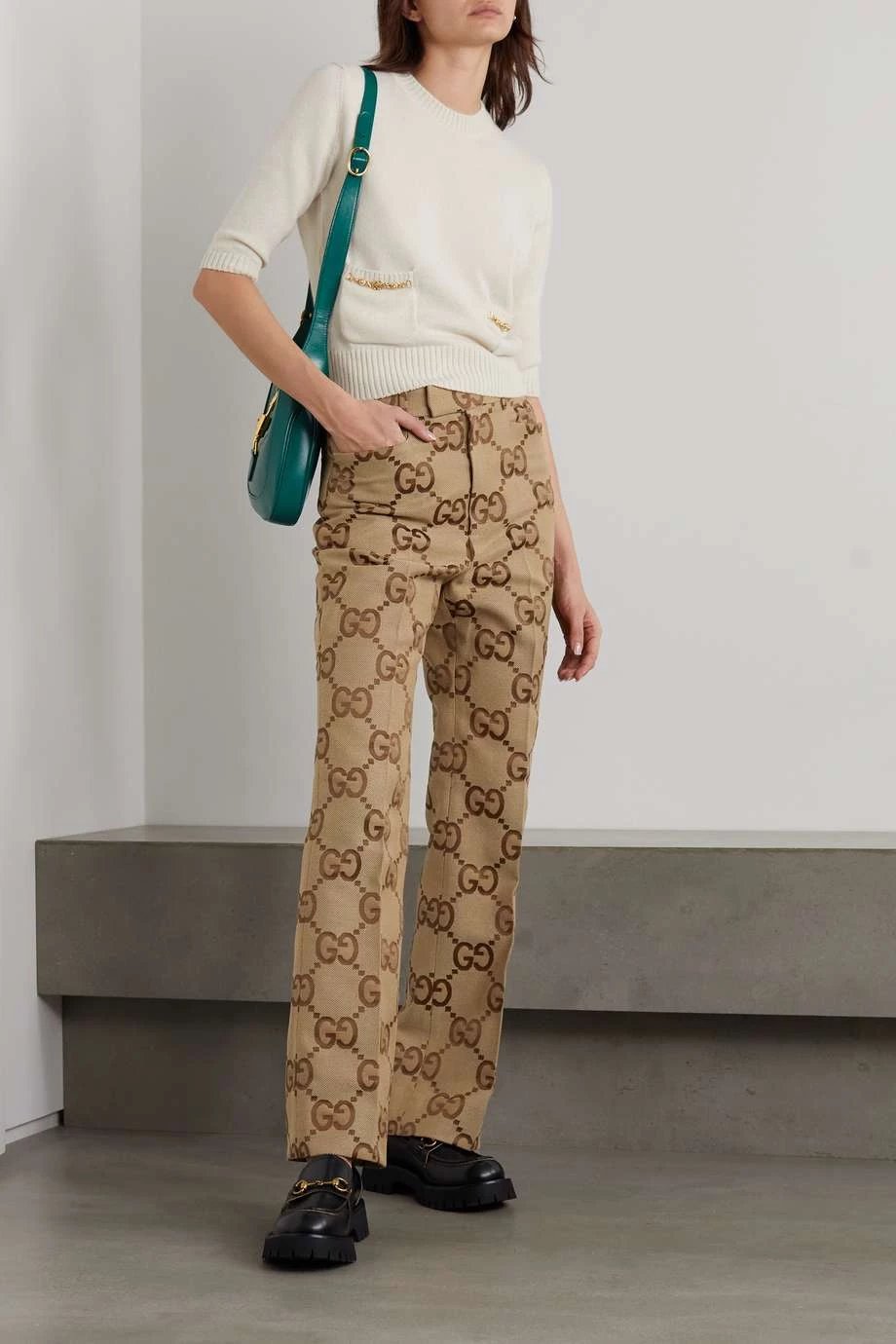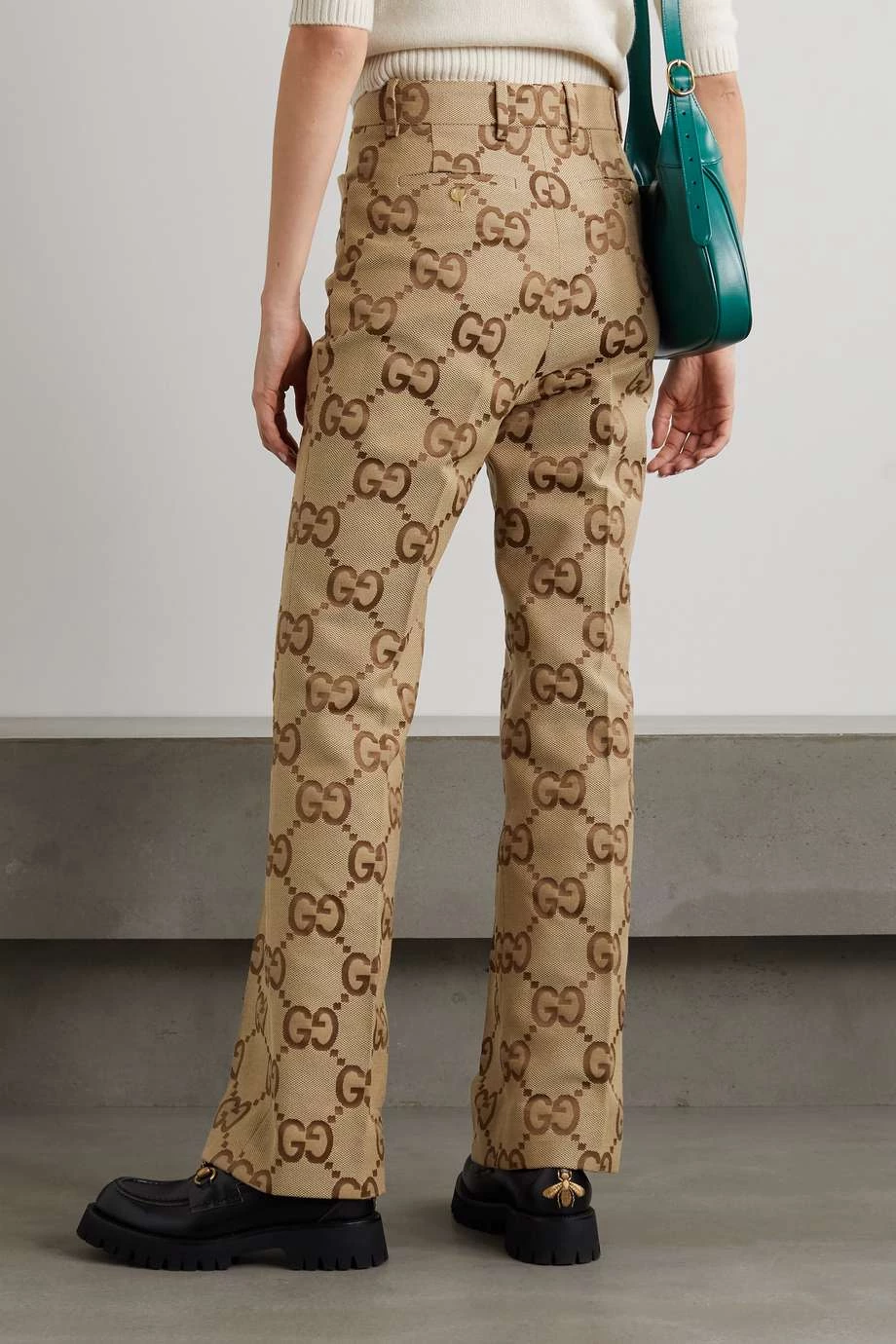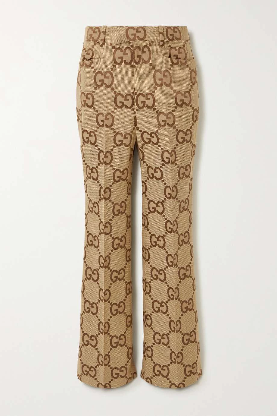 Diese Hose von Gucci besteht aus Canvas aus einer Baumwollmischung mit einem Jacquard-Muster, das das ikonische „GG“-Monogramm in Groß zeigt. Das Modell mit geradem Bein hat optisch streckende Falten und einen hohen Bund mit Gürtelschlaufen. Tragen Sie einen der Pullover des Hauses oder ein Hemd dazu.