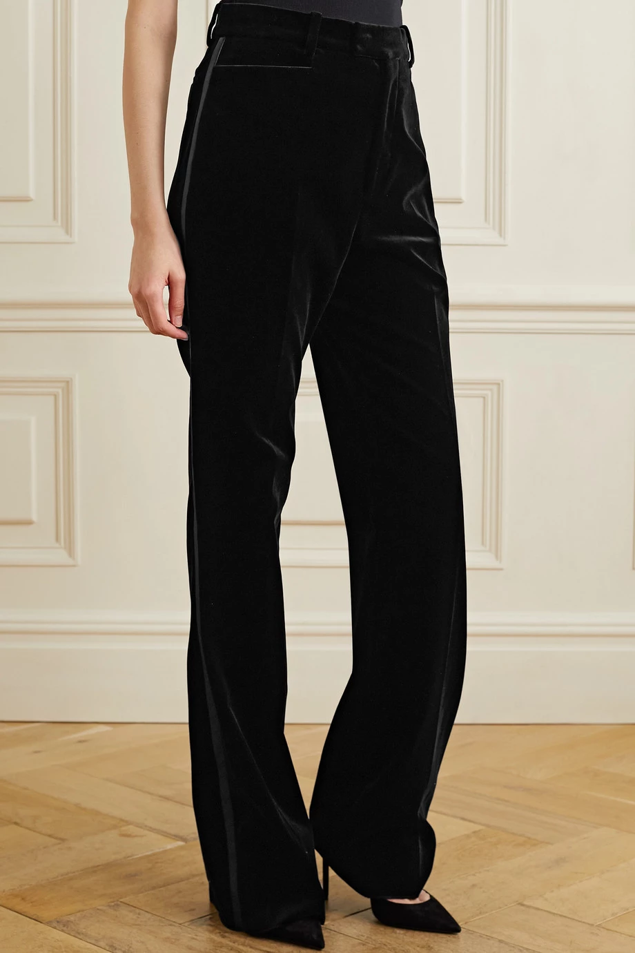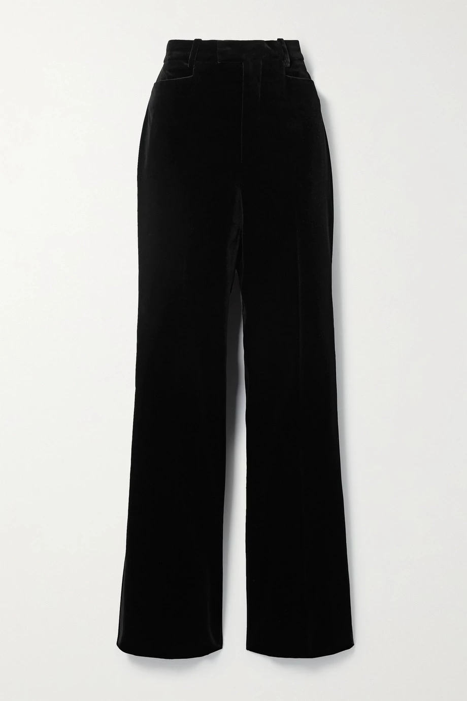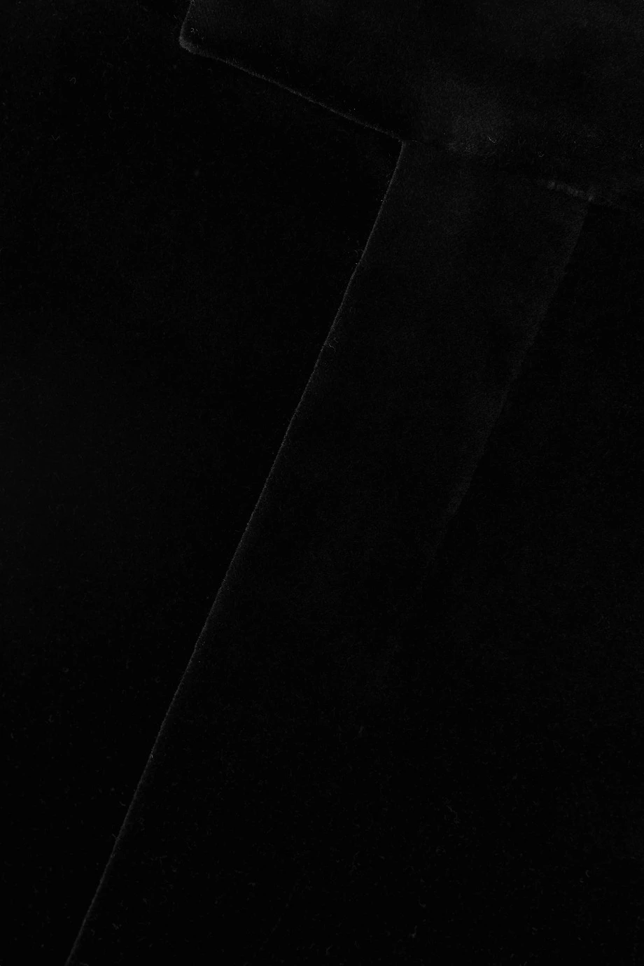Für die schicken Kleidungsstücke der „Aria“ Kollektion ließ sich Gucci von Originalen aus dem eigenen Archiv inspirieren: Jene stammen aus den 90er- und frühen 2000er-Jahren, als Tom Ford Kreativdirektor der Marke war. Diese Hose mit geradem Bein wurde in Italien aus schwarzem Samt aus Stretch-Baumwolle gefertigt und an der Seite des Beins mit einem Seidenstreifen gestaltet. Wir empfehlen eine gemusterte Bluse oder ein T-Shirt mit Print dazu.