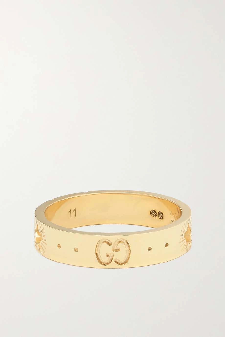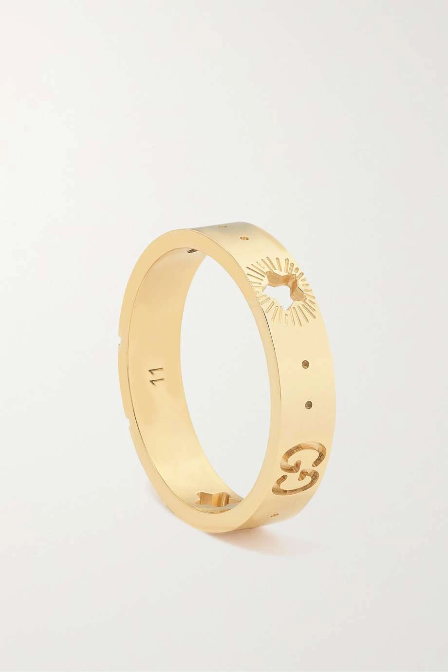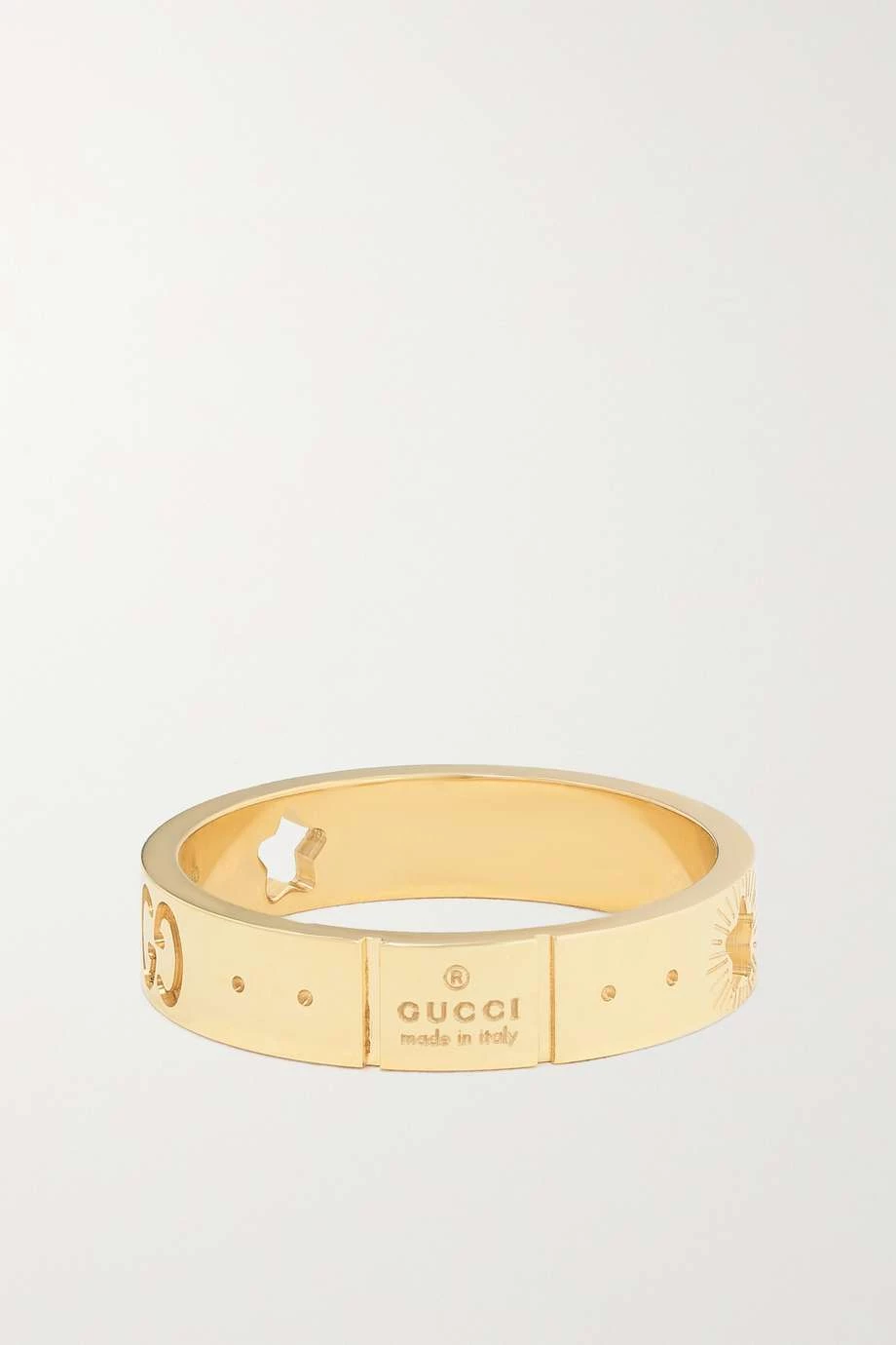 Dieser Ring aus der „Icon“ Kollektion, die Gucci für Resort 2022 herausbringt, zeigt sich mit Symbolen aus dem Bereich der Astronomie. Zudem wurde das Modell aus glänzendem 18-karätigem Gold mit einer Gravur in Form des „GG“-Logos verziert. Da es schmal ist, eignet es sich perfekt für den Alltag.