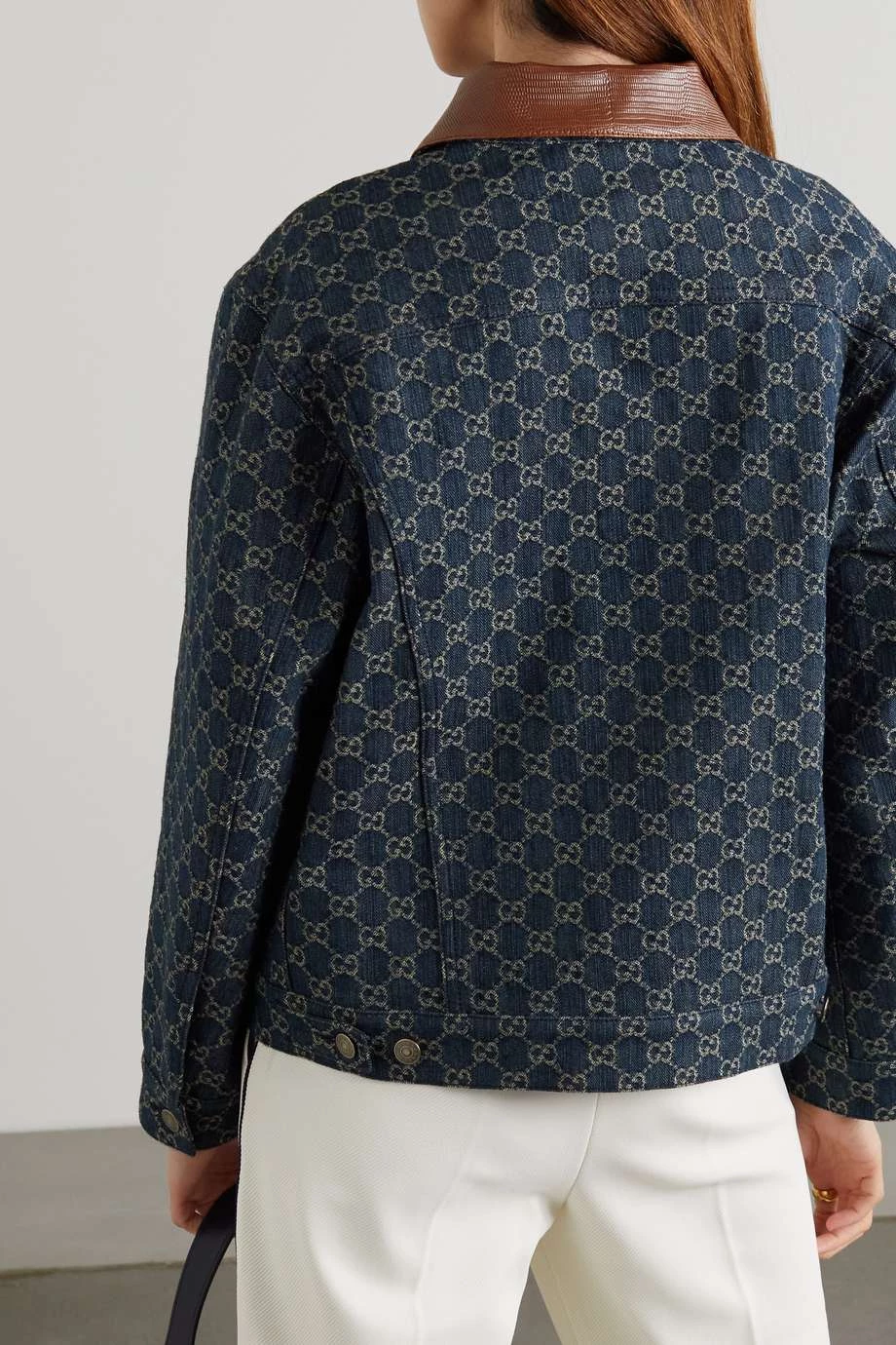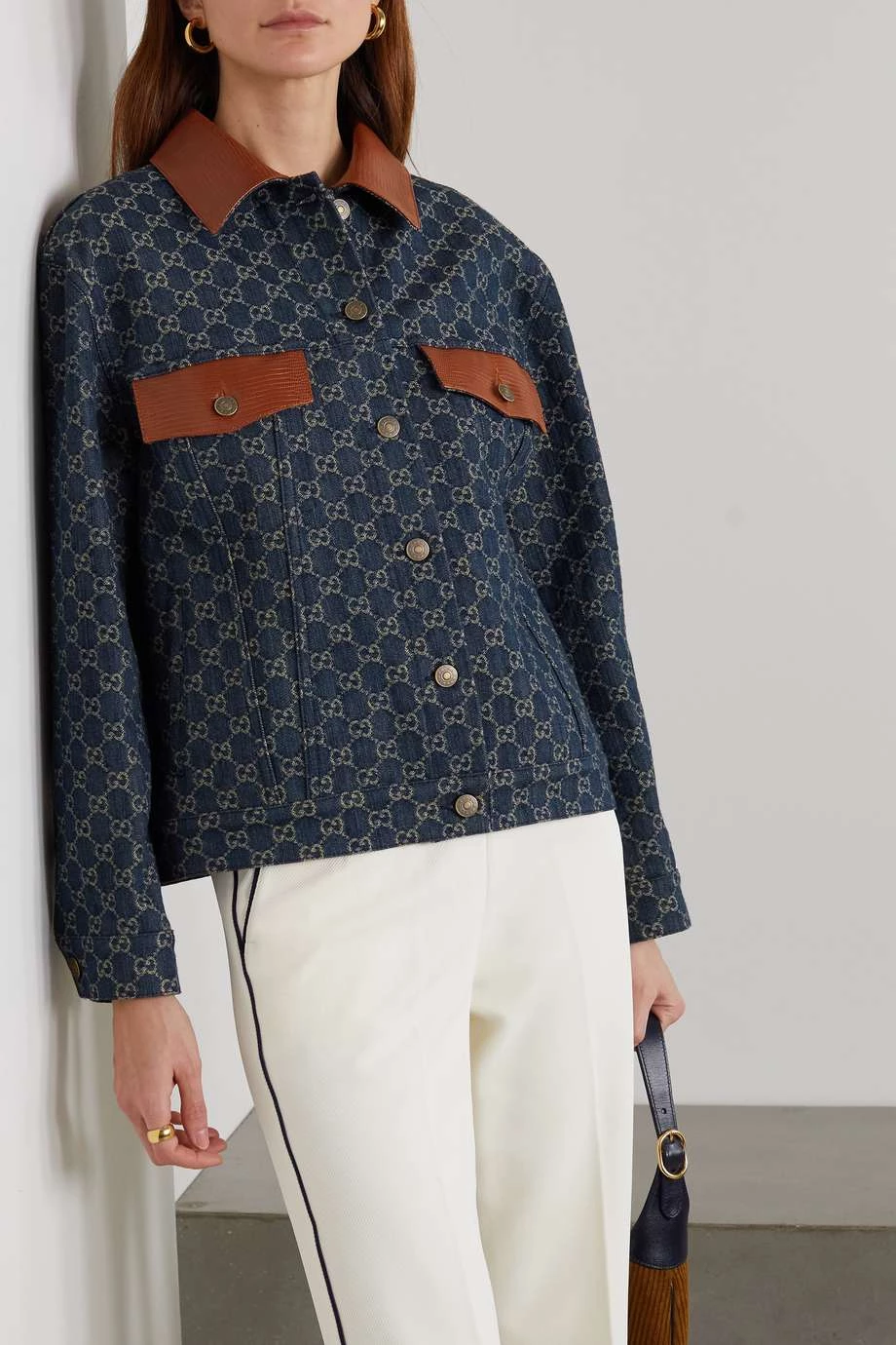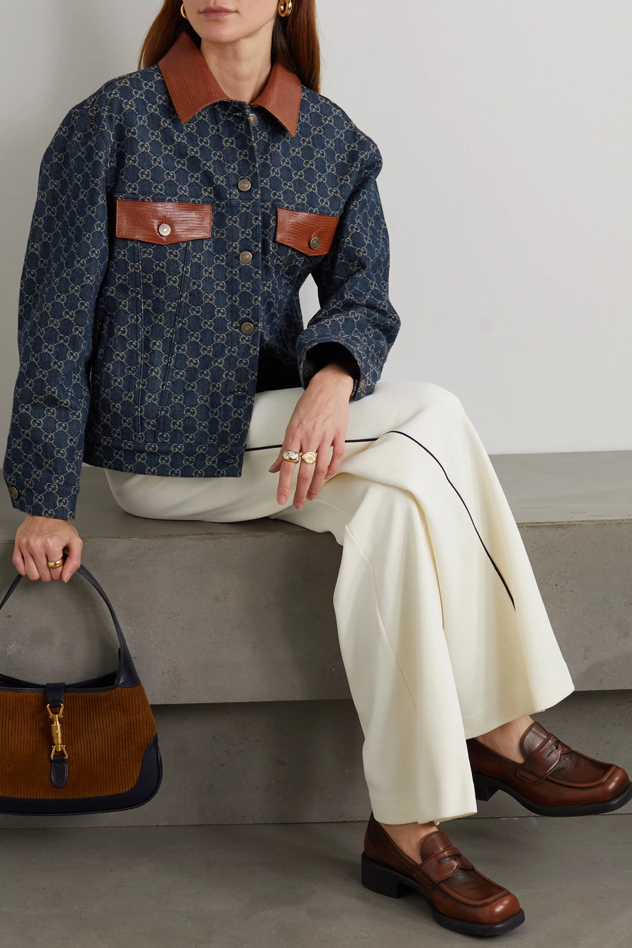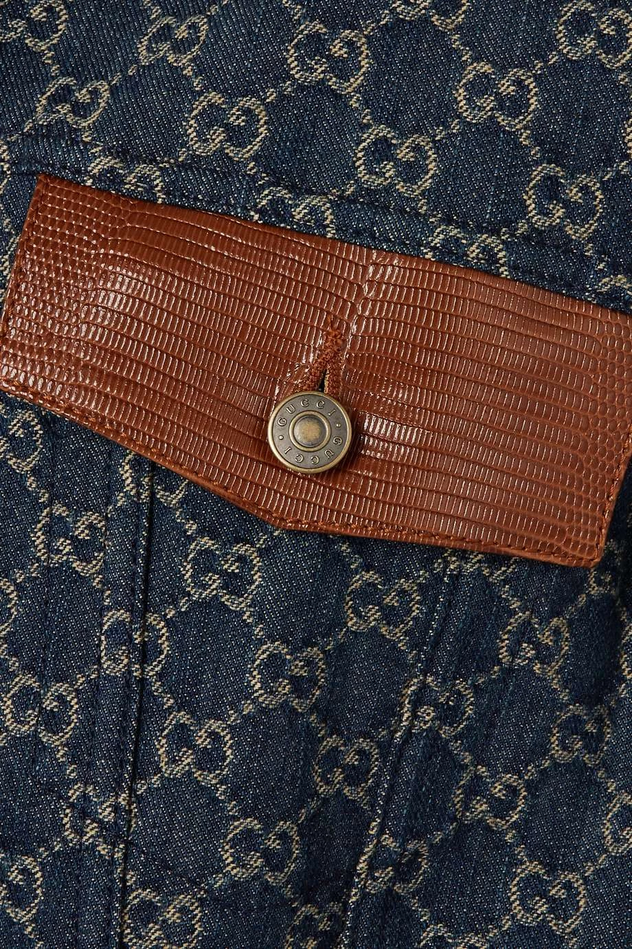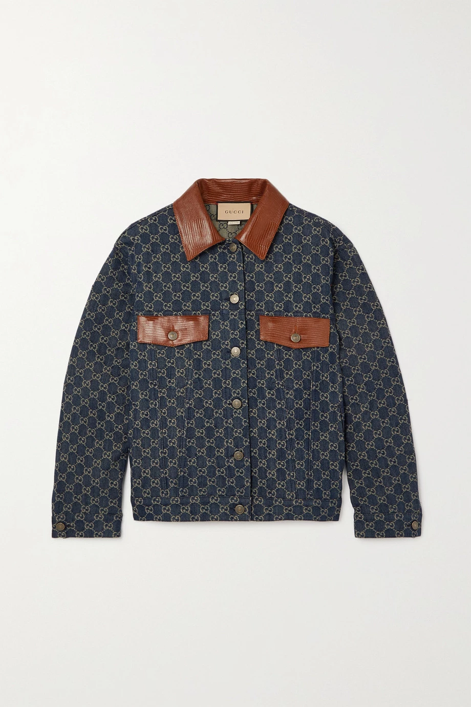 In der F/S 22-Kollektion von Gucci finden sich smarte, meisterhaft gefertigte Kleidungsstücke, die sich sowohl durch markentypische als auch verspielte Details auszeichnen – wie diese Jeansjacke: Das Modell zeigt sich mit einem Jacquard-Muster aus dem „Supreme“-Monogramm des Labels und wurde mit Besätzen aus Leder mit Eidechseneffekt gestaltet.