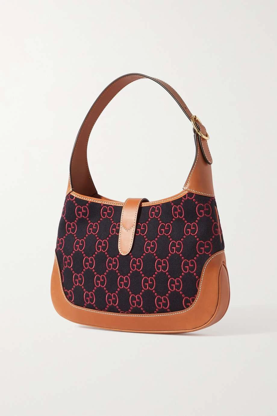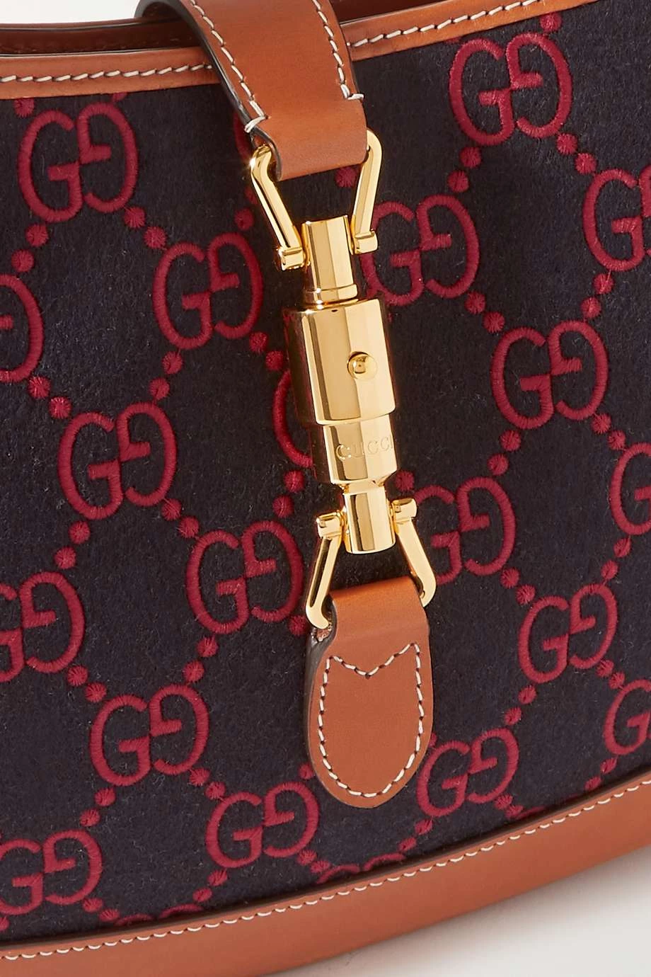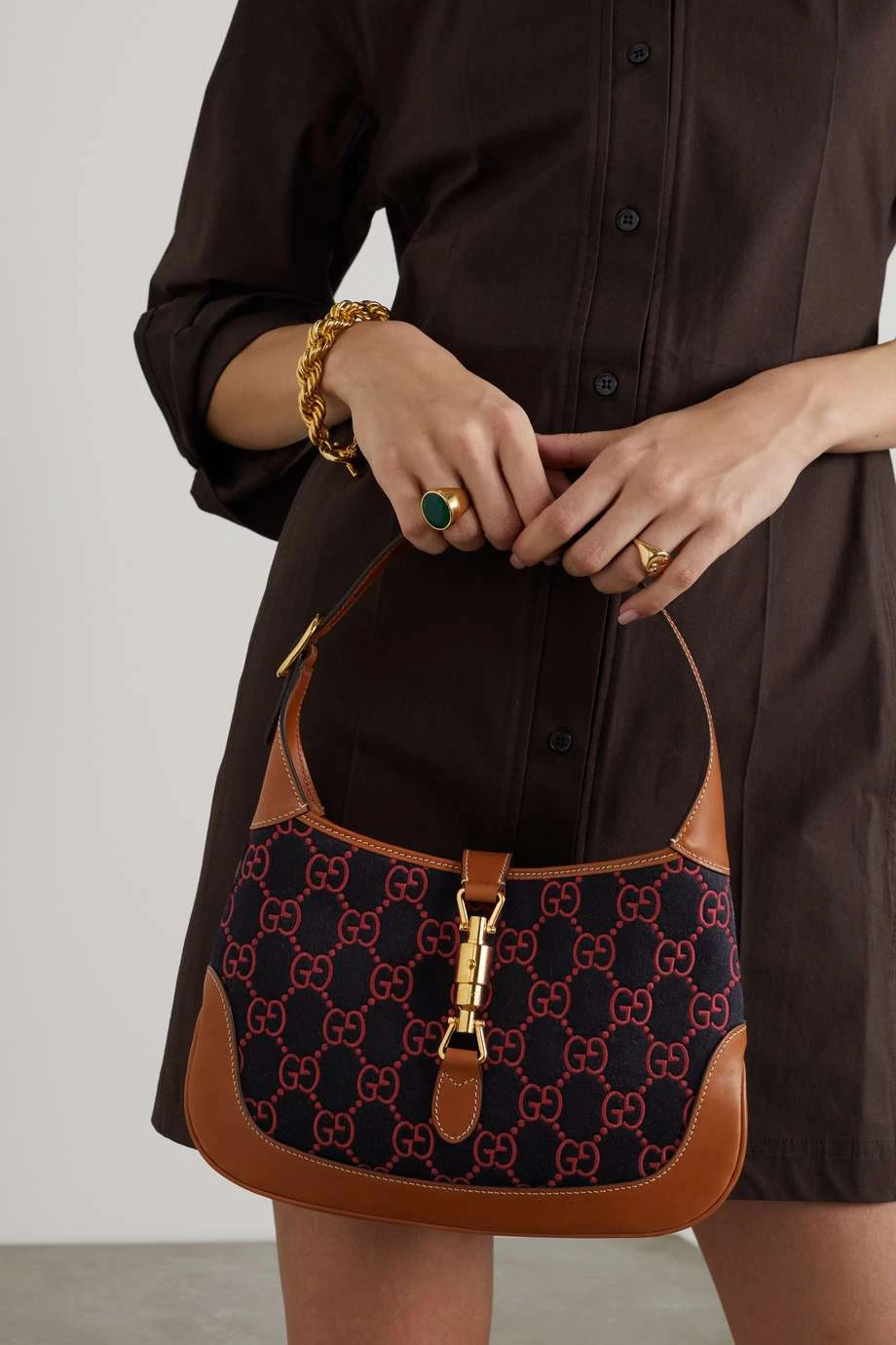 Die formstabile, geschwungene „Jackie“ Tasche befindet sich bereits seit dem Jahr 1961 im Sortiment von Gucci. Diese Version wurde in Italien aus Woll-Jacquard mit Logomuster gefertigt und mit Glattlederbesätzen verstärkt. Zudem wird sie wie das Original von einem goldglänzenden Steckverschluss akzentuiert.