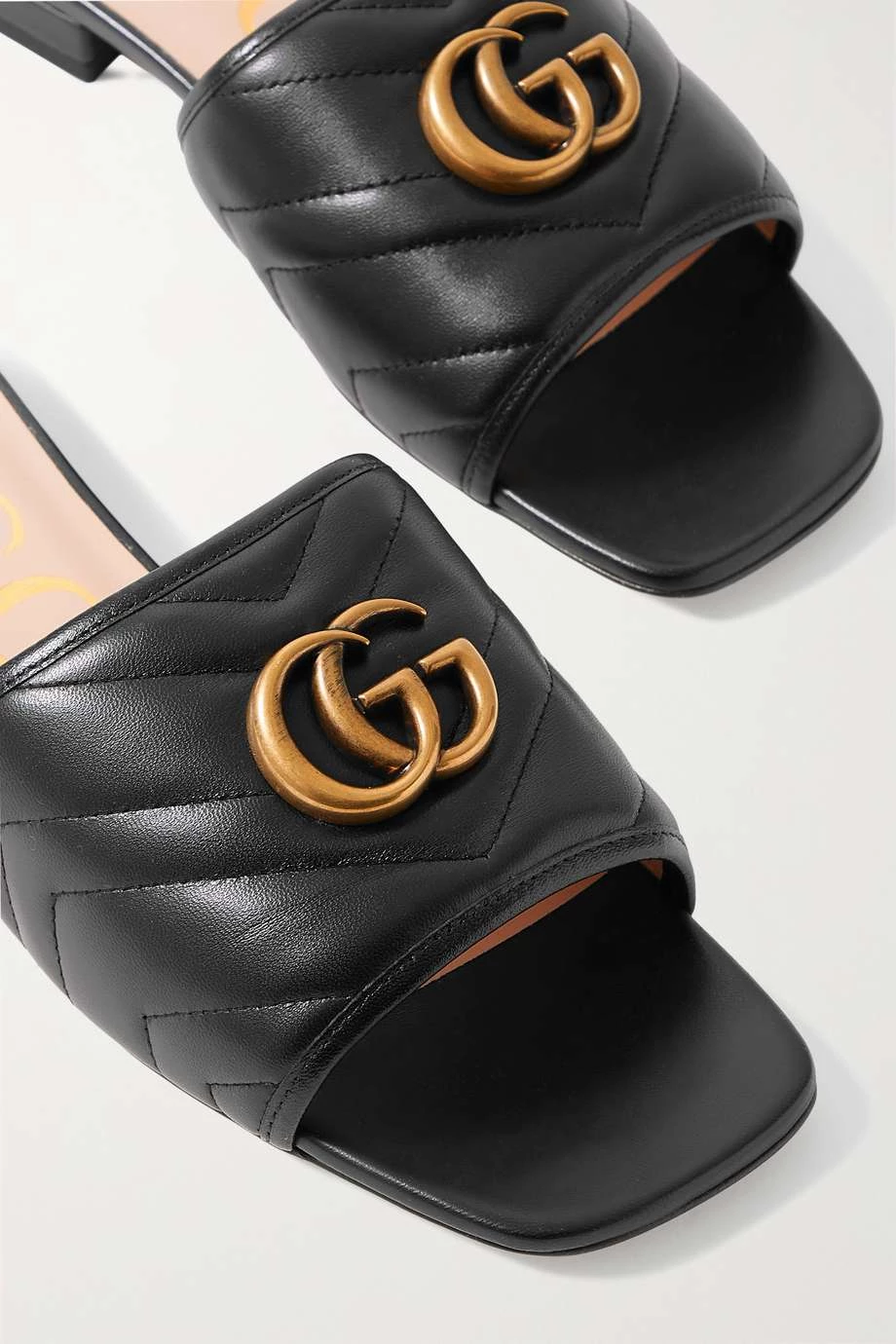 Die schicken „Jolie“ Pantoletten von Gucci eignen sich perfekt für warme Tage – beispielsweise können Sie sie im Urlaub zu fließenden Röcken oder in der Heimat zu verkürzten Jeans und smarten Hosen tragen. Das in Italien gefertigte Paar aus butterweichem Leder mit zickzackförmigem Steppmuster ist mit dem „GG“-Logo des Hauses verziert.