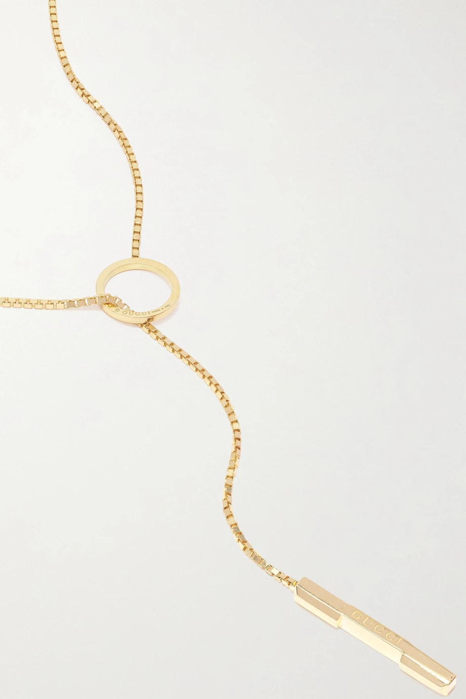 Diese Kette von Gucci entstammt der „Link to Love“ Kollektion, für welche das Haus mit zeitgemäßer Romantik experimentierte. Das Schmuckstück wurde in Italien aus 18-karätigem Gold gefertigt und mit einem schmalen Stabelement mit eingraviertem Markennamen verziert. Da Sie die Länge wahlweise kürzer oder länger stellen können, lässt es sich ideal mit anderen Modellen kombinieren.