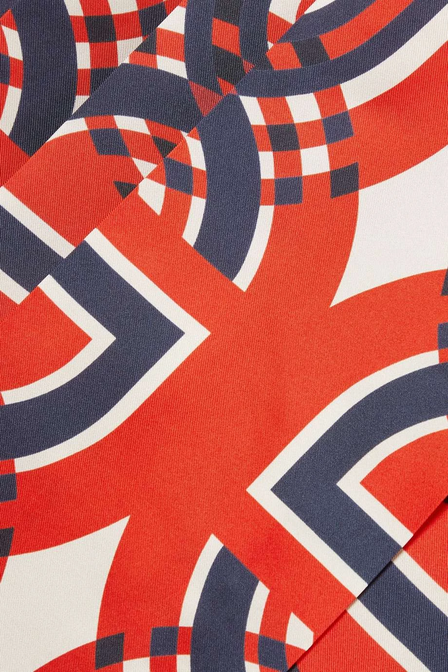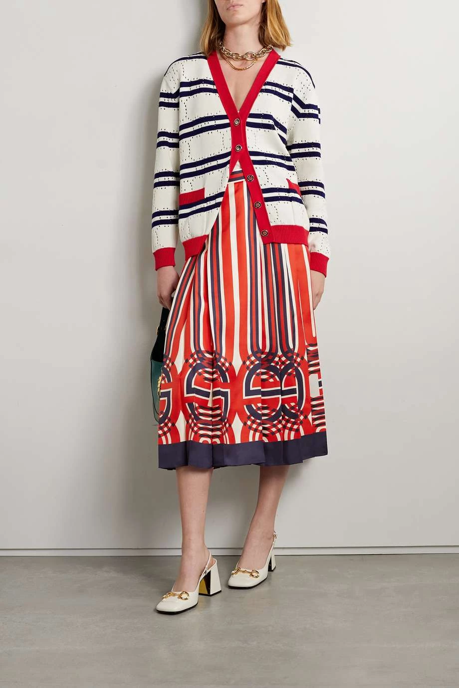 Für diesen Rock mit Falten hat sich Gucci von abstrakter Kunst inspirieren lassen: Das ikonische Logo der Marke ist hier Teil eines Musters, das eine interessante Tiefe hat. Das hoch sitzende Modell wurde in Italien aus glänzendem Seiden-Twill gefertigt. Dazu passt ein Sweatshirt der Marke in den gleichen Farben.