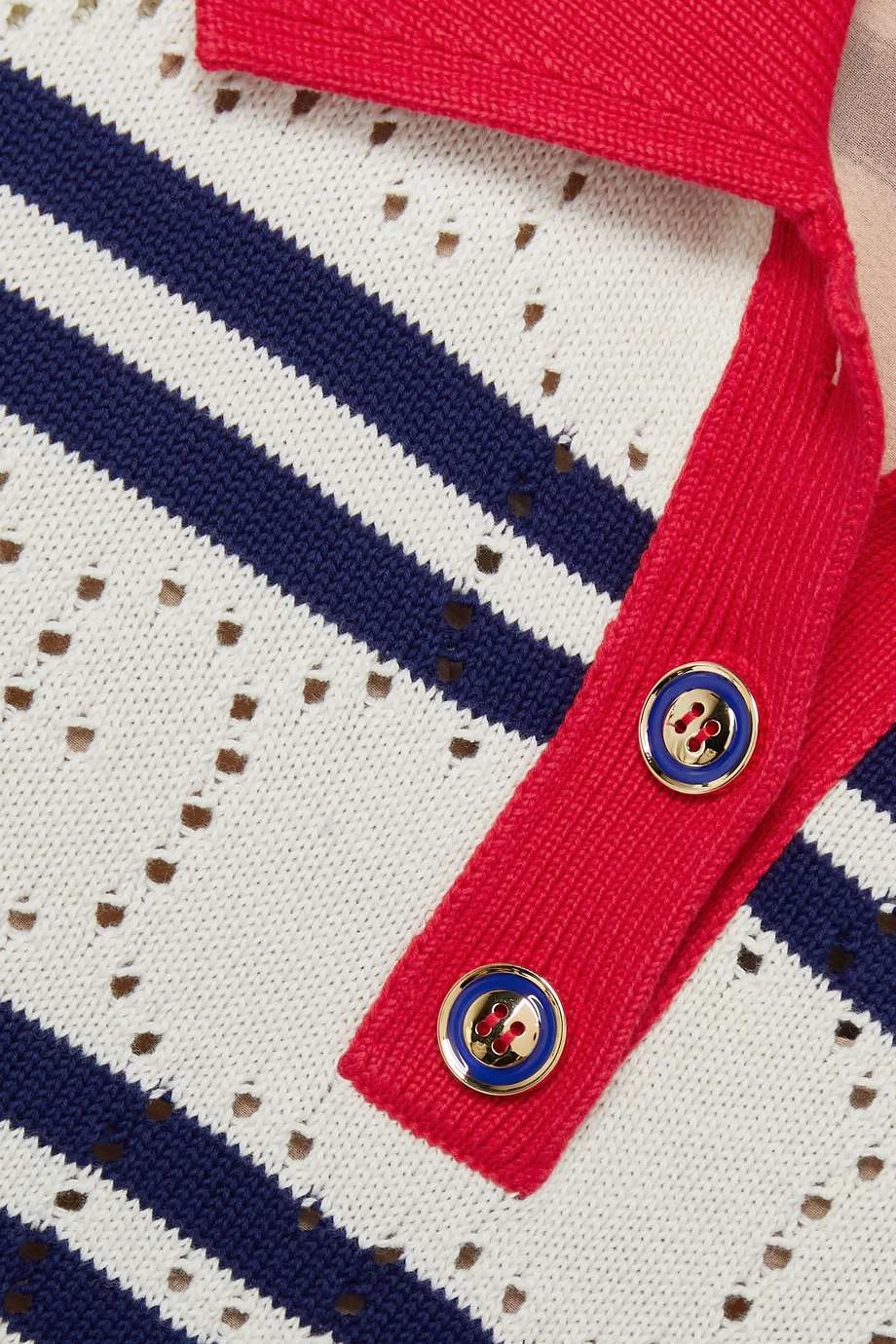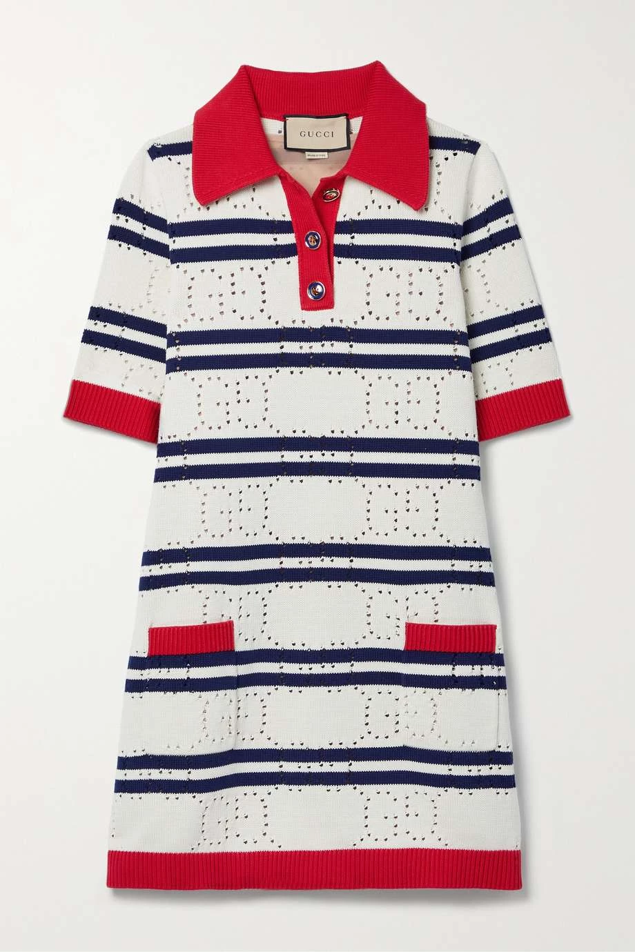 Dieses Minikleid von Gucci hat ein sportliches Design und Pointelle-Motive in Form des „GG“–Logos. Das gestreifte Modell, das in Italien aus weicher Baumwolle gefertigt wurde, hat eine leicht lockere Passform und kleine Taschen an der Vorderseite. Wir empfehlen weiße Sneakers dazu.