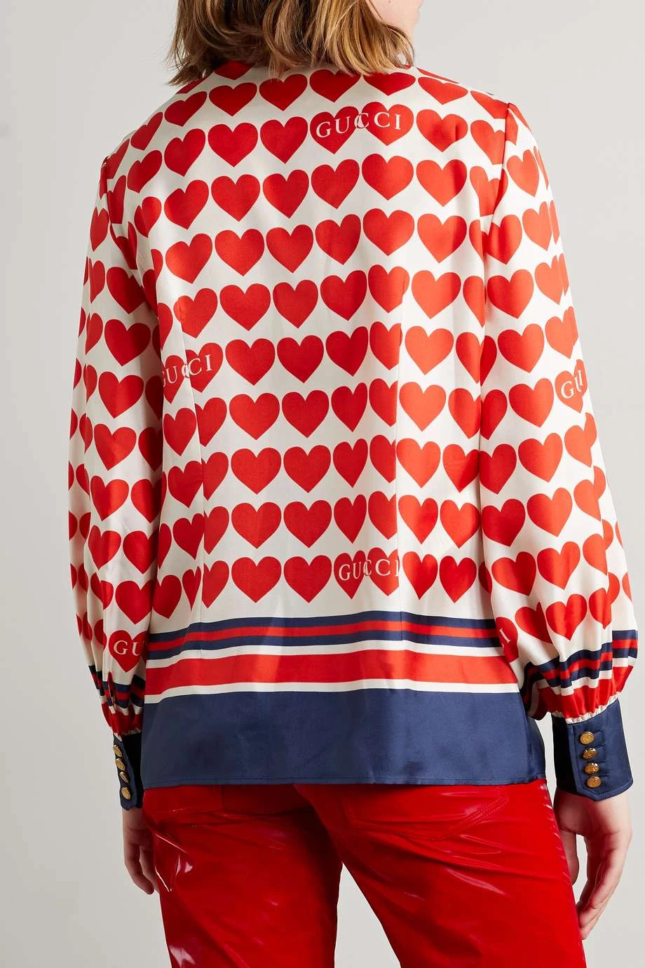 Dieses Hemd zeigt sich mit einem Druck aus Herzmotiven und entstammt der „Love Parade“ Kollektion von Gucci, die romantisches Flair verströmt. Das in Italien gefertigte, leicht lockere Modell aus Seiden-Twill hat goldglänzende Knöpfe, die vom „GG“-Logo geziert werden, und Schluppenbänder – man kann Letztere abnehmen, wenn ein schlichterer Look gewünscht ist.