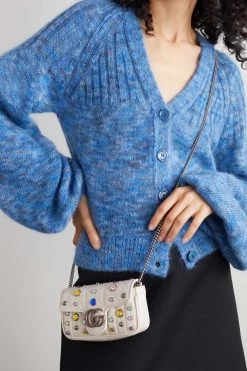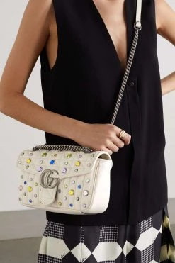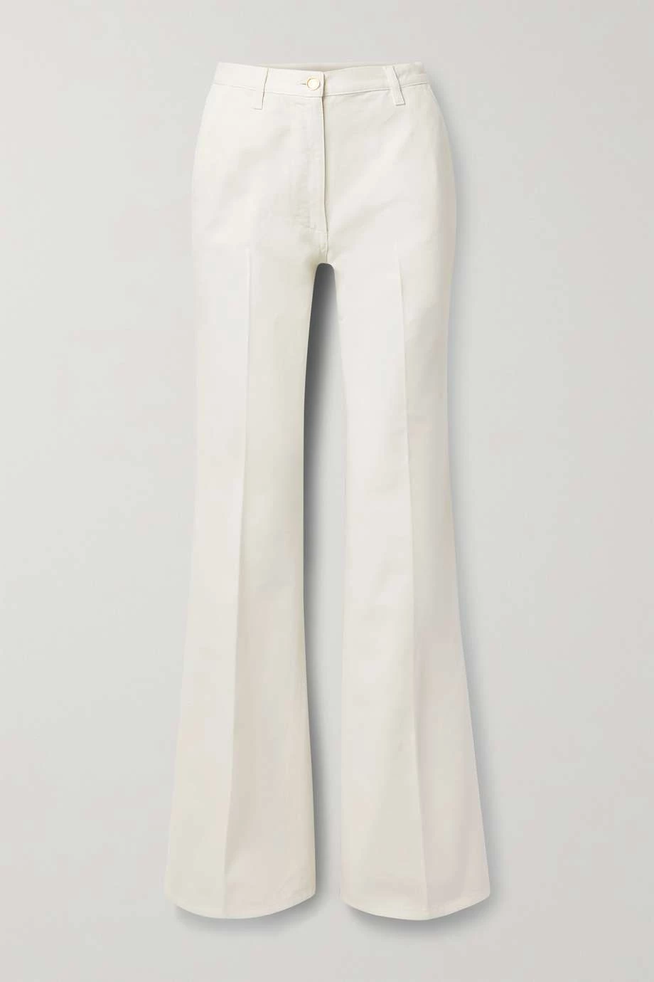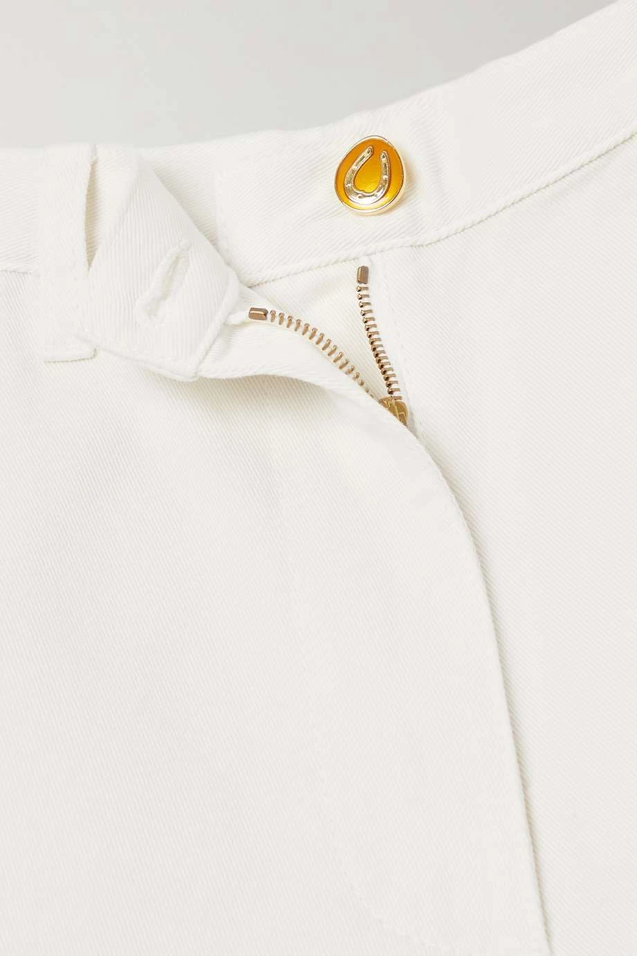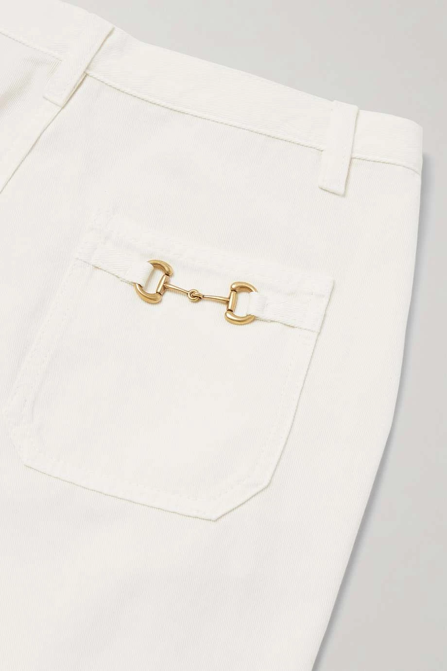 Diese Jeans von Gucci zeigt sich an den Gesäßtaschen mit den ikonischen „Horsebit“-Details der Marke und vorne mit einem Knopf, den ein emailliertes Hufeisen ziert – eine Hommage an die traditionsreiche Vergangenheit der Marke im Reitsport. Das hoch sitzende Modell mit geradem Bein wurde aus weißem Denim gefertigt und mit optisch streckenden Bügelfalten gestaltet.