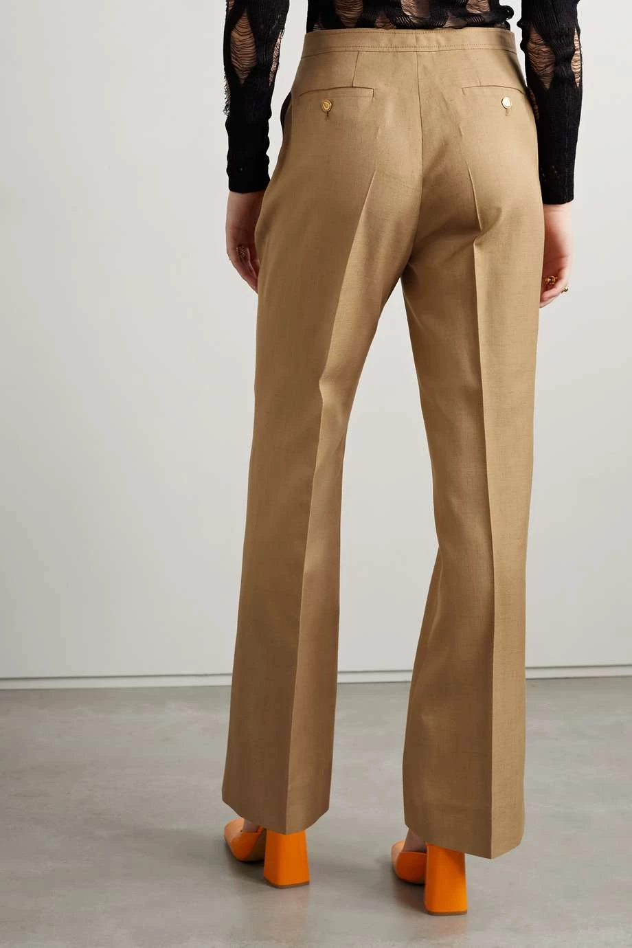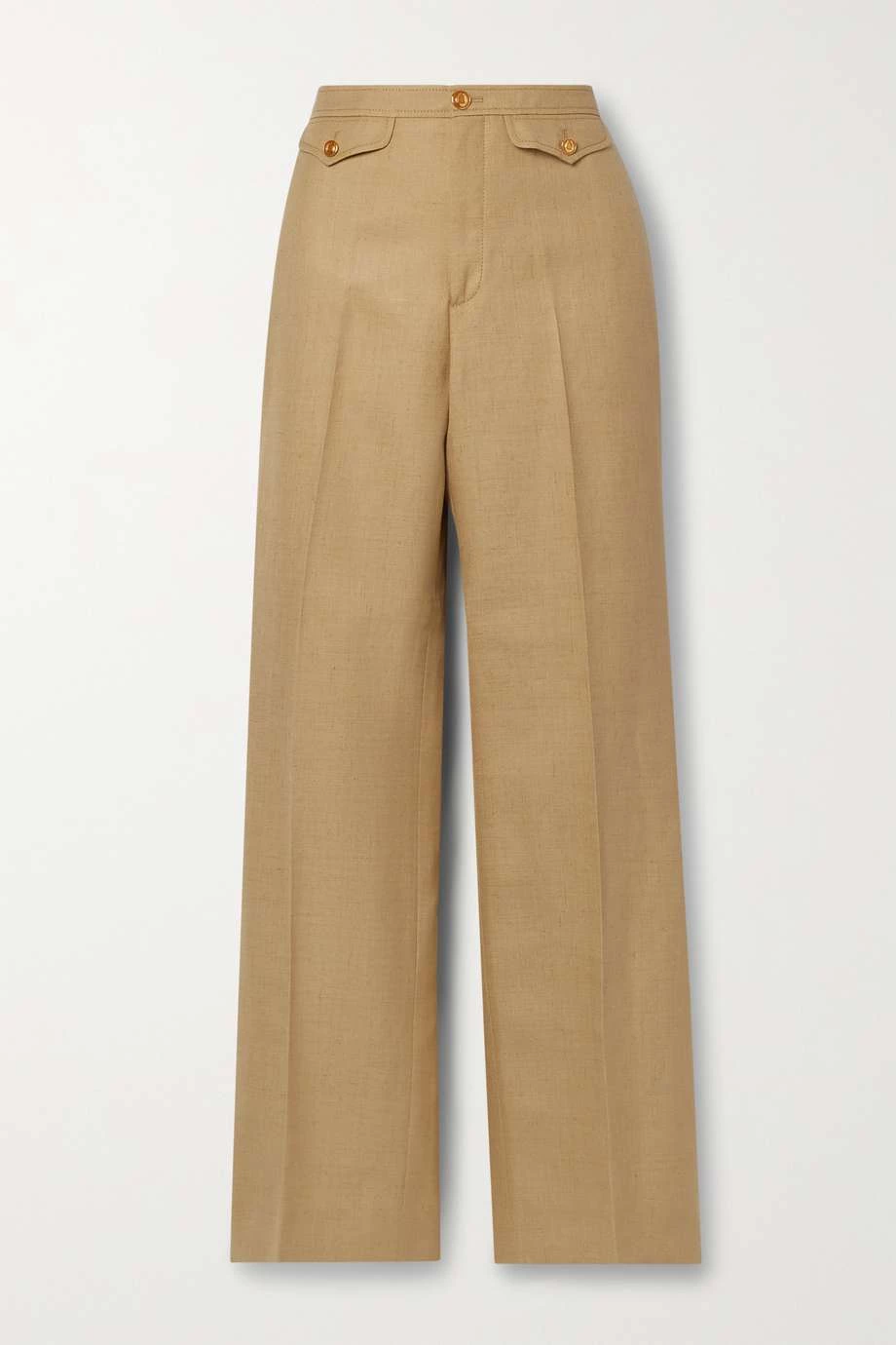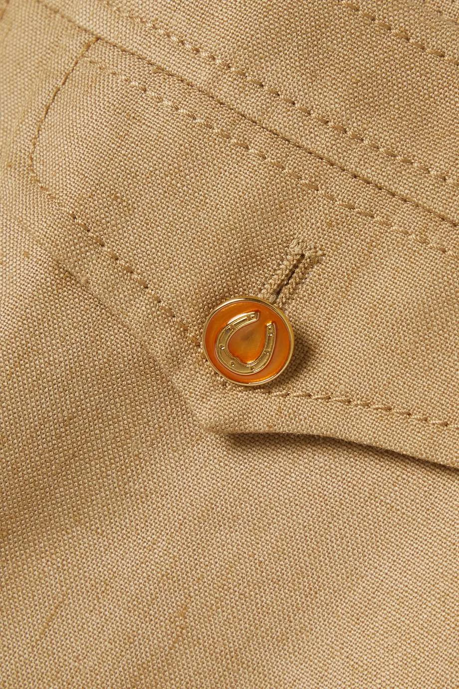 Diese luftige Hose von Gucci besteht aus Webstoff mit Leinenanteil in einem vielseitigen Sandton und lässt sich problemlos stylen. Das hoch sitzende Modell mit geradem Bein zeigt sich mit Bügelfalten, die es optisch verlängern. Die glänzenden Knöpfe wurden mit einem Hufeisen gestaltet, einer Hommage an die Geschichte des Hauses im Reitsport.
