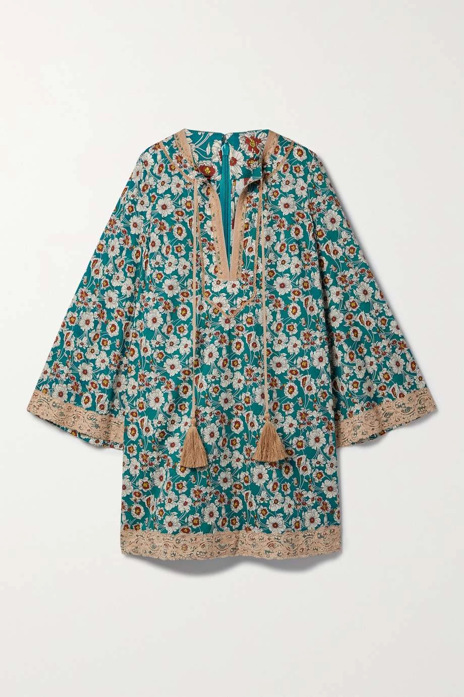Dieses Minikleid von Gucci verströmt legeres Bohème-Flair. Es wurde in Italien aus leichtem Voile aus einer Baumwollmischung gefertigt und mit malerischen Blumen bedruckt. Das lockere Modell zeigt sich zudem mit Spitzenbesätzen. Lassen Sie die Bänder mit Troddeln wahlweise offen.