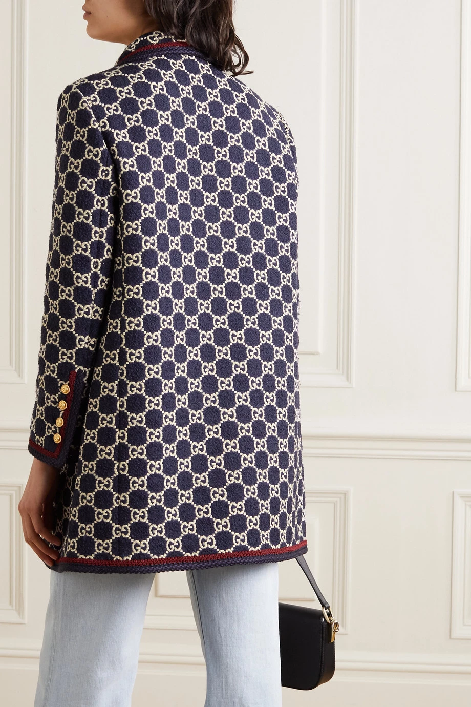 An diesem Mantel von Gucci befinden sich einige Markenzeichen des Hauses: glänzende Knöpfe mit Logoprägung und Webstreifen in klassischem Navyblau-Rot. Das leicht lockere, doppelreihige Modell wurde in Italien aus Bouclé-Tweed aus einer Baumwollmischung und mit einem eingewebten Muster aus dem „GG“-Monogramm gefertigt. Ziehen Sie es beispielsweise über Minikleidern oder Jeans an.