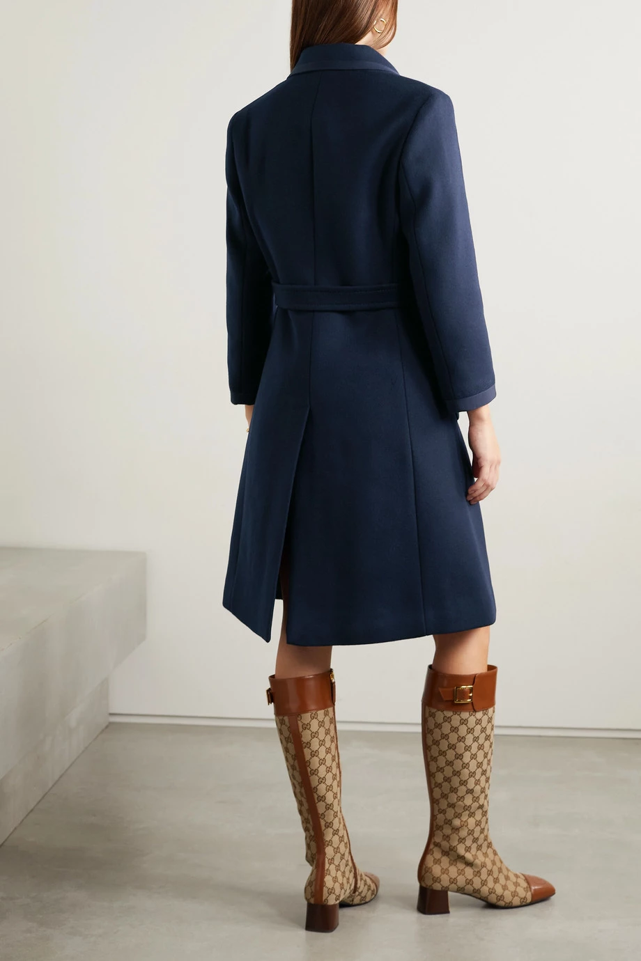 Dieser Mantel von Gucci wurde an den Taschen mit goldglänzenden Ketten verziert, die das „GG“-Logo darstellen – auch die emaillierten Knöpfe zeigen sich mit dem ineinandergreifenden Monogramm. Das schmale Modell besteht aus einer Wollmischung in vielseitigem Dunkelblau und hat einen Riegel an der Rückseite sowie ein fallendes Revers. Da es vollständig gefüttert ist, lässt es sich geschmeidig über Strickpullover und Blazer ziehen.