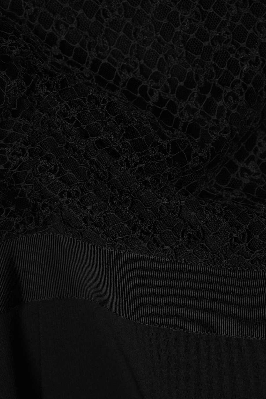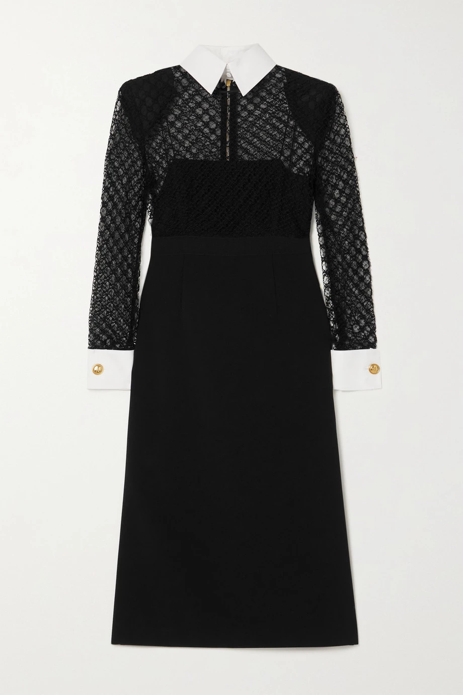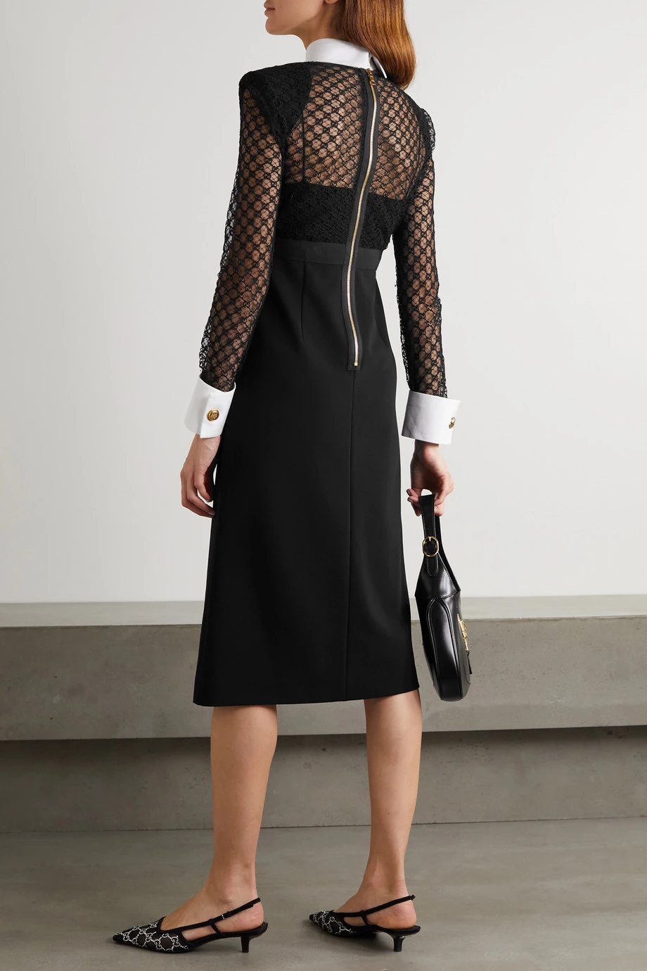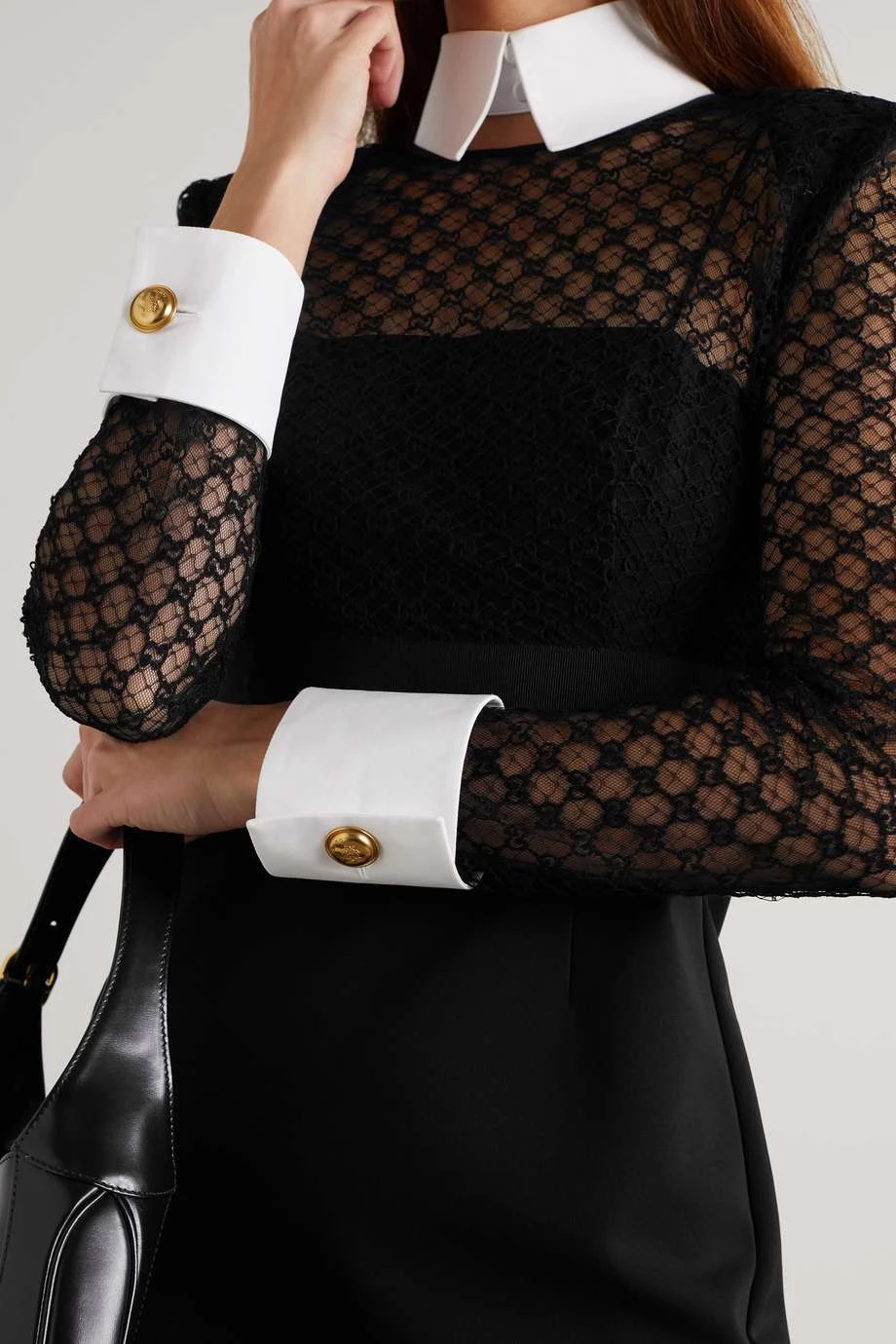 Alessandro Michele kennt sich mit eleganten Modellen genauso gut aus wie mit auffälligen. Dieses schwarze Kleid von Gucci besteht aus glattem Crêpe und farblich passendem Tüll, der mit dem ikonischen „GG“-Logo des Hauses bestickt ist. Die Manschetten und der Kragen in Weiß sorgen für Form.