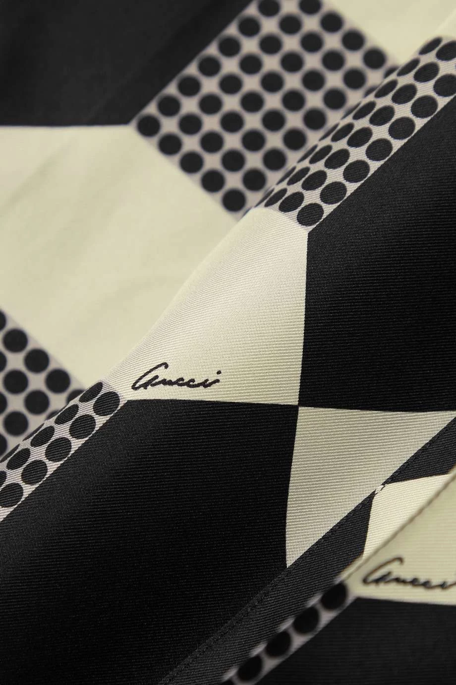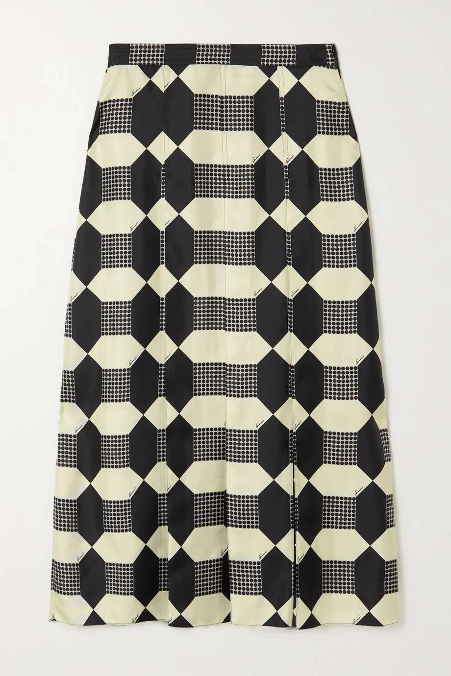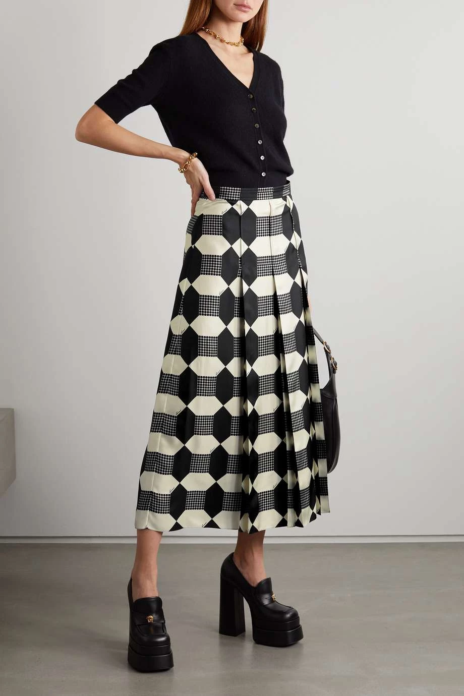 Dieser smarte Midirock von Gucci wurde in Italien aus fließendem Seiden-Twill gefertigt und zeichnet sich durch ein auffälliges Muster aus geometrischen Motiven aus. Das Modell sitzt an der Taille und schwingt dank der Falten beim Gehen sanft mit. Wir empfehlen einen verkürzten Pullover und Brogues dazu.
