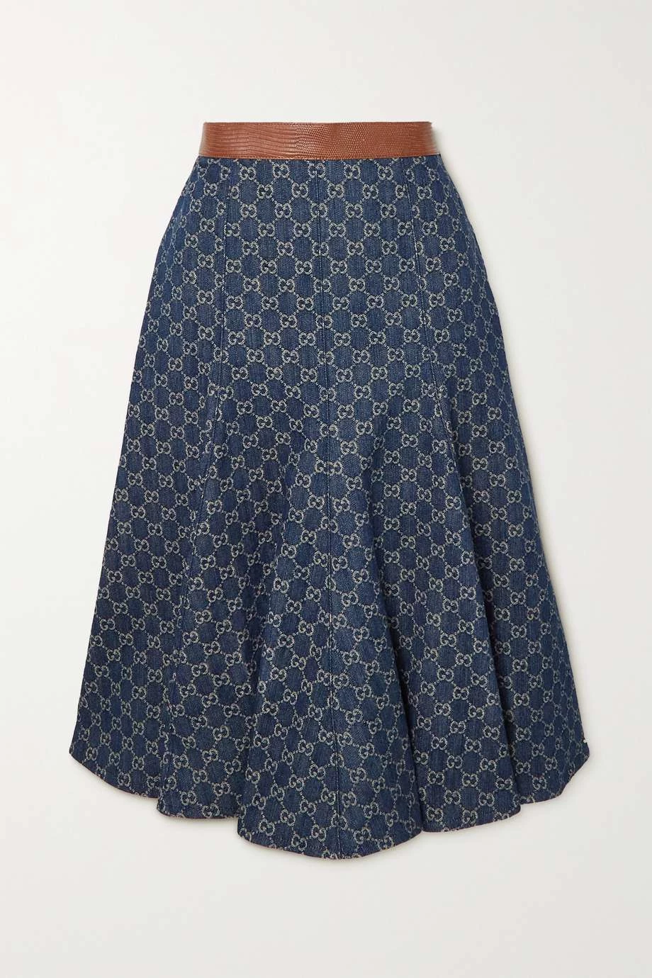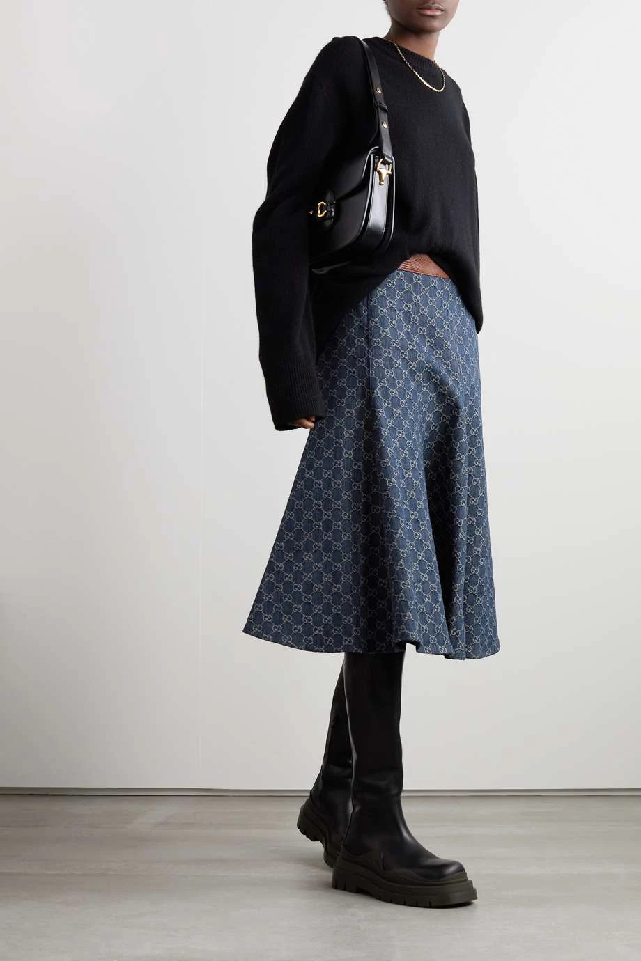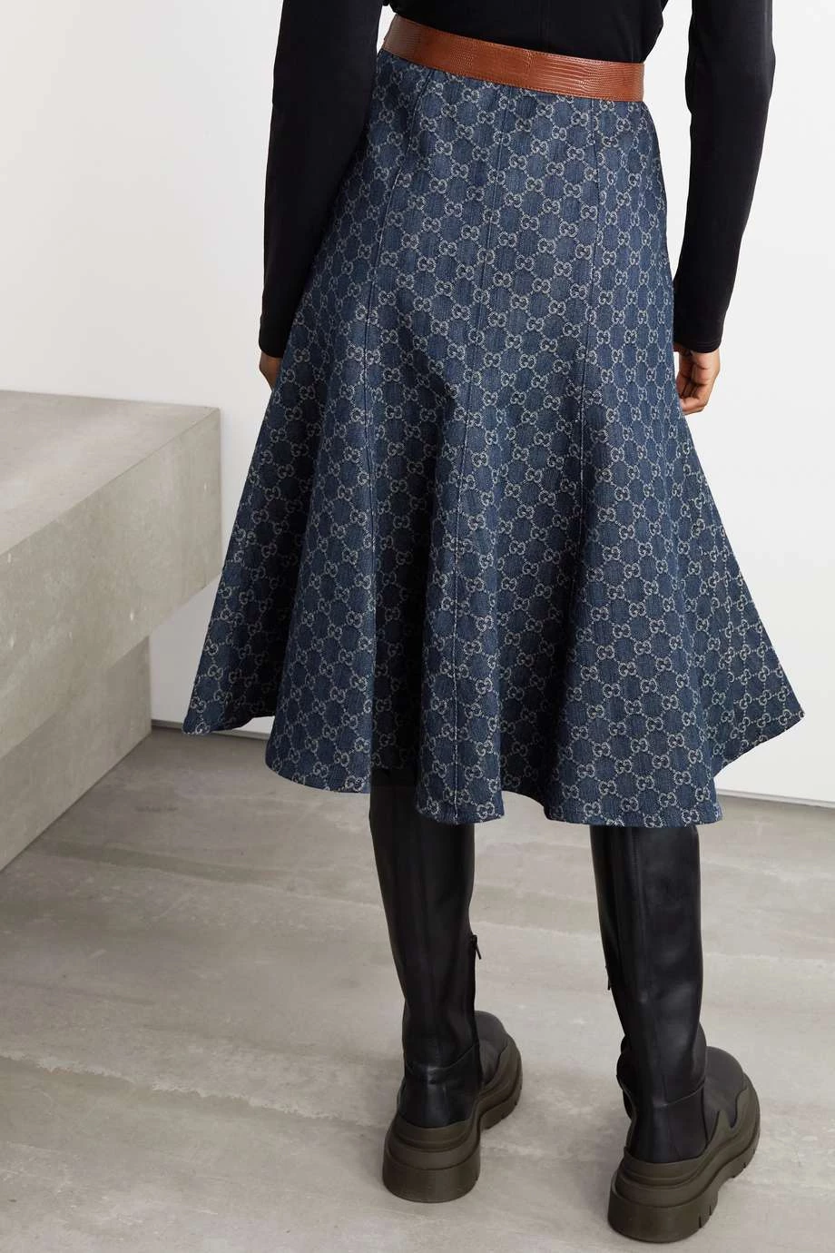 Dieser Rock von Gucci wirkt dank des ausgestellten Schnitts und der leicht verblassen „Eco Wash“-Waschung wie ein Vintage-Original. Das Modell wurde in Italien aus Bio-Denim gefertigt und an der Taille mit einem Lederbesatz mit Eidechseneffekt gestaltet. Es zeichnet sich durch ein Jacquard-Muster aus dem „Supreme“-Logo der Marke aus und ergibt ein cooles Outfit, wenn Sie die passende Jacke und Stiefel dazu tragen.