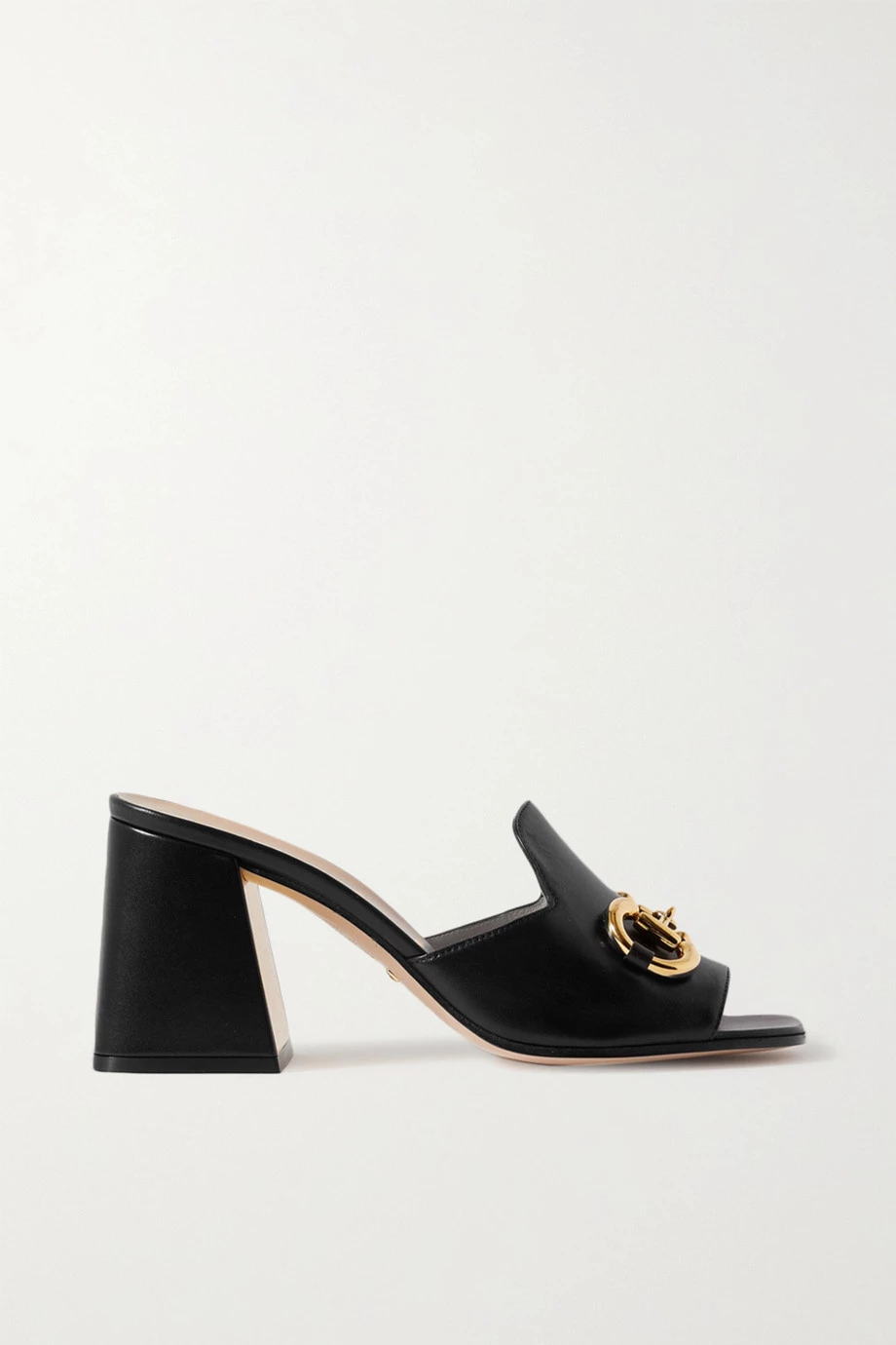 Laut eigener Aussage vereinte Gucci in der „Ouverture“ Kollektion Elemente aus mehreren Zeiträumen, um neue Designs zu kreieren. Diese in Italien gefertigten Mules aus glattem Leder sind beispielsweise mit einer großen Version des unverkennbaren goldglänzenden „Horsebit“-Details verziert. Zudem haben sie einen breiten Blockabsatz.