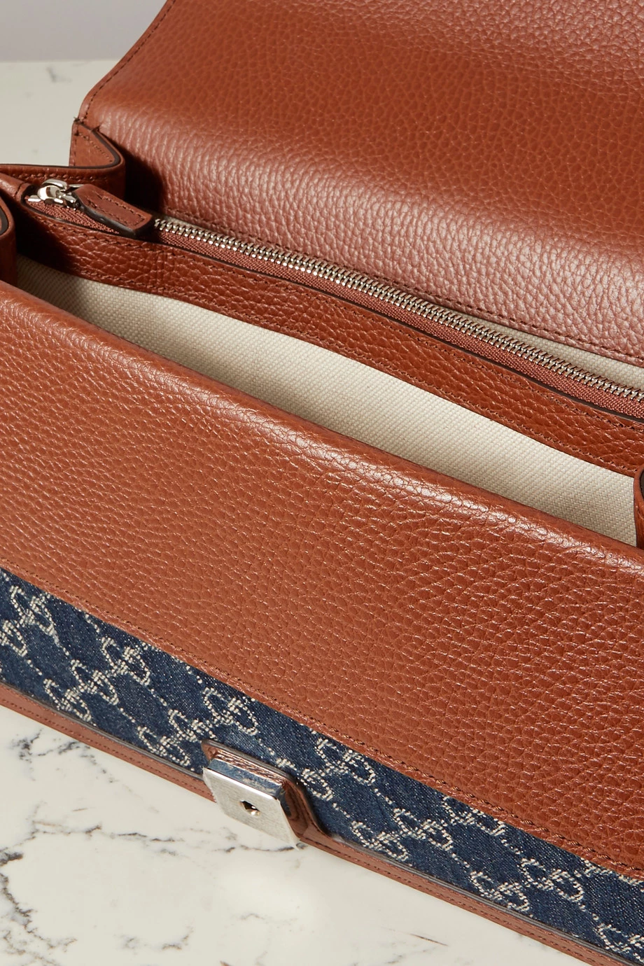 - Bio-Denim in Dunkelblau und Elfenbein, Leder in Braun