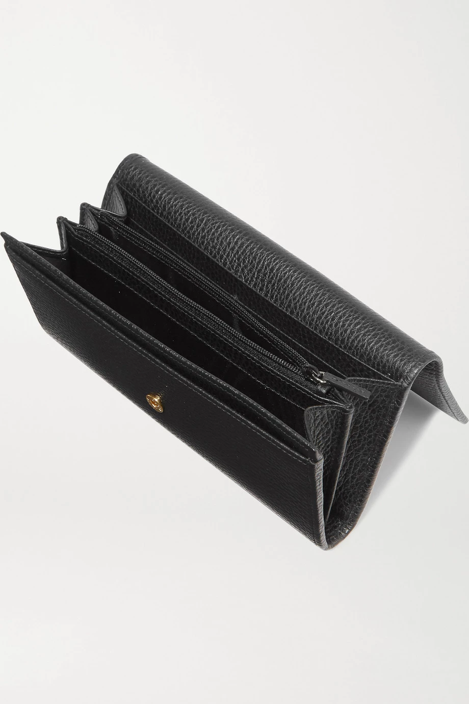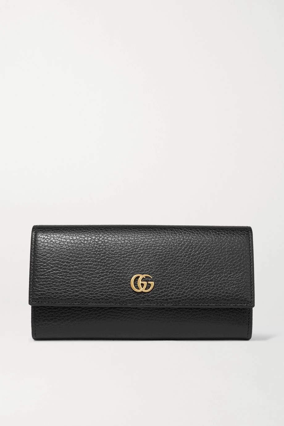 Dieses Portemonnaie von Gucci wurde in Italien aus chromfrei gegerbtem strukturiertem Leder gefertigt und lediglich mit dem berühmten „GG“-Detail verziert. Im Inneren finden sich ein Reißverschlussfach sowie mehrere Schlitze für Karten, Scheine und Quittungen. Das Accessoire lässt sich problemlos in einer der „Marmont“ Totes des Labels unterbringen.