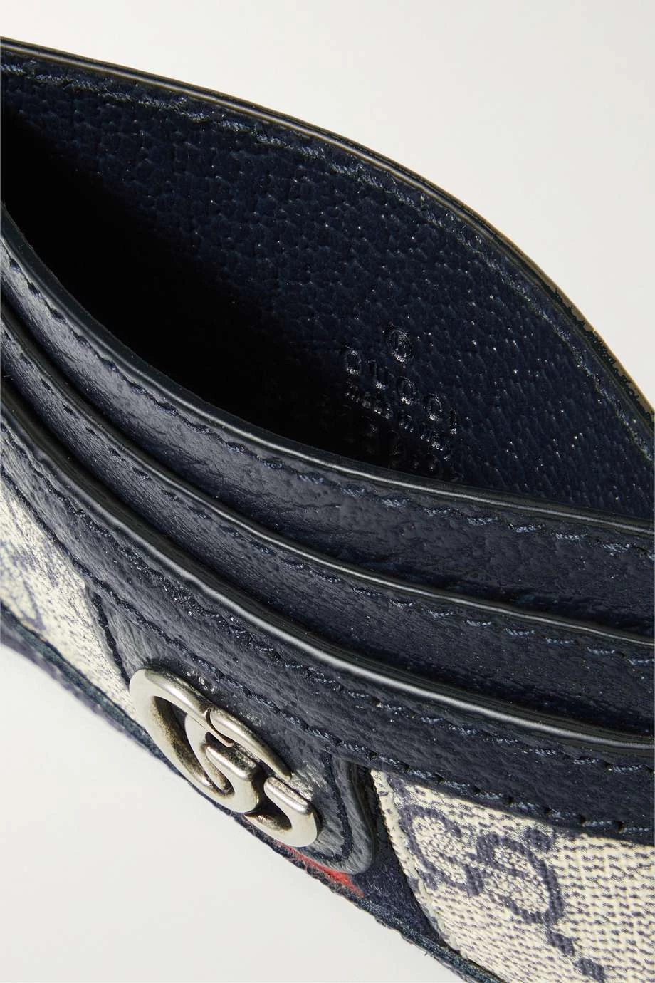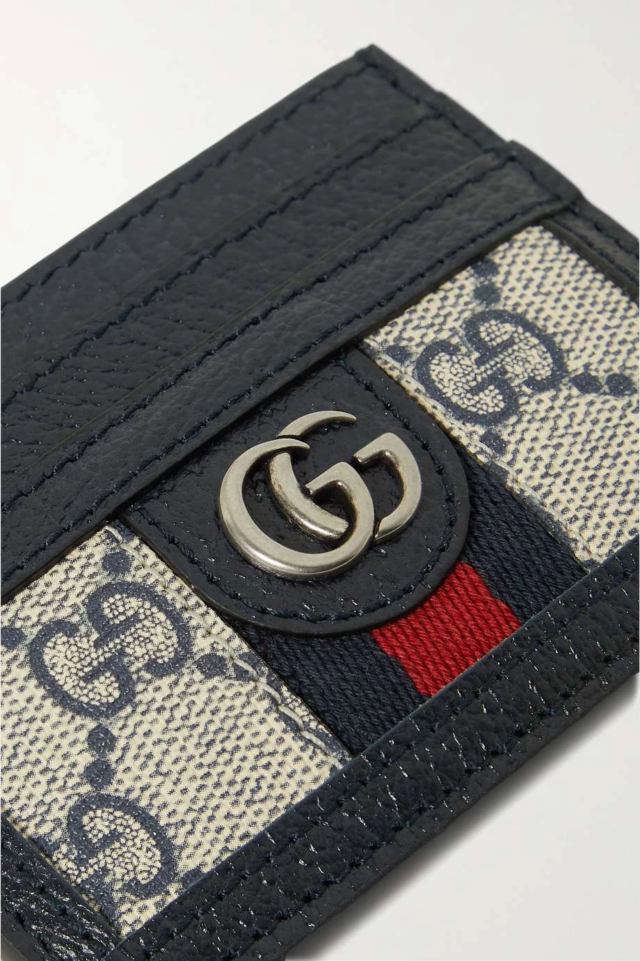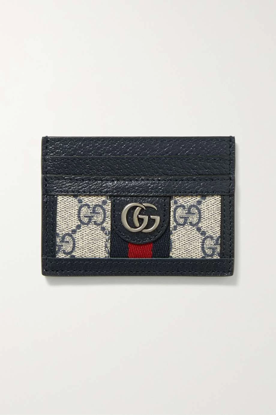 Dieses Kartenetui von Gucci ist an die charakteristischen „Ophidia“ Modelle der Marke angelehnt und besteht daher ebenso aus bedrucktem beschichtetem Canvas, der mit strukturiertem Leder besetzt ist. Zudem wird es vom traditionellen dunkelblau-roten Webstreifen des Hauses geziert und bietet mehrere Kartenschlitze. Dank des kompakten Formats passt es auch problemlos in kleinere Taschen und Clutches.