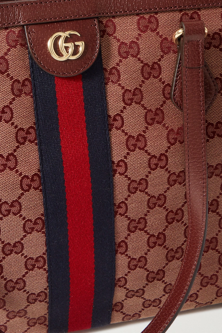 Die „Ophidia“ Tote von Gucci weist alle typischen Markenzeichen des Hauses auf – das gestreifte Webband, das brünierte „GG“-Logo sowie das „Supreme“-Muster. Im geräumigen Inneren findet sich ein Reißverschlussfach und Platz für alle wichtigen Alltagsbegleiter. Diese Version besteht aus robustem Canvas und ist mit Leder eingefasst.