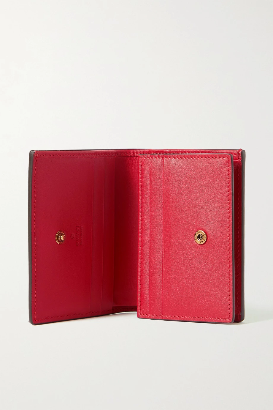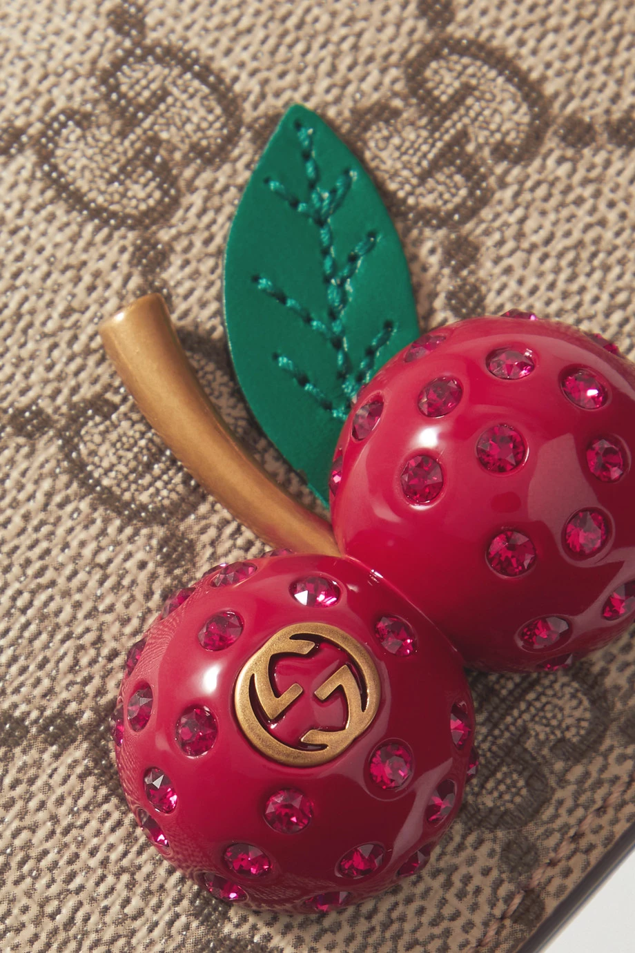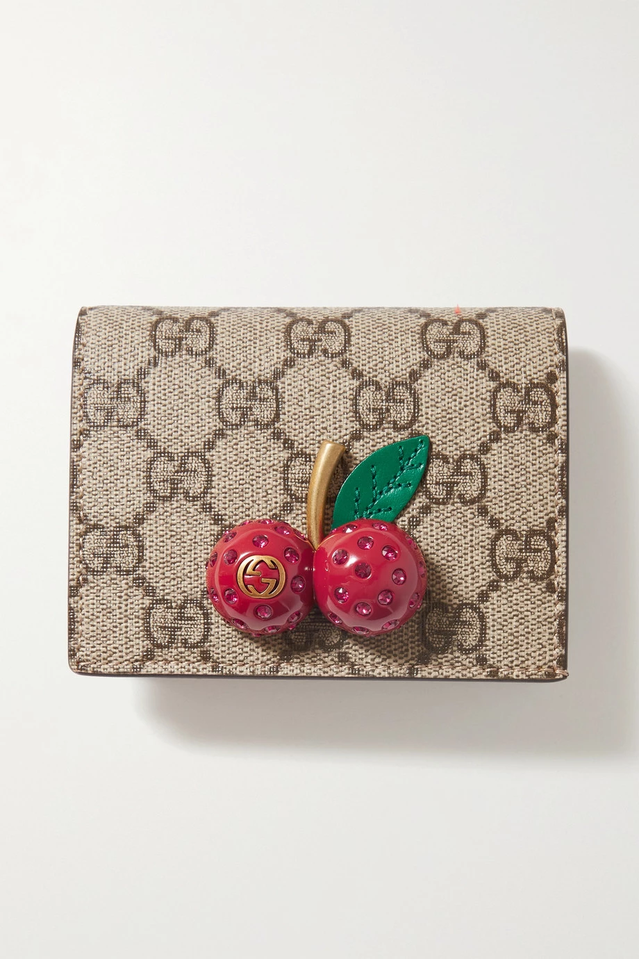Das „Ophidia“ Portemonnaie von Gucci ist mit kristallbesetzten 3D-Kirschen verziert, die für eine verspielte Note sorgen. Das in Italien gefertigte Accessoire besteht aus dem markentypischen beschichteten Canvas mit Logomuster und hat ein leuchtend rotes Inneres, das vier Kartenschlitze sowie ein Reißverschlussfach für Münzen bietet. Dank der kompakten Form passt es in so gut wie jede Tasche.