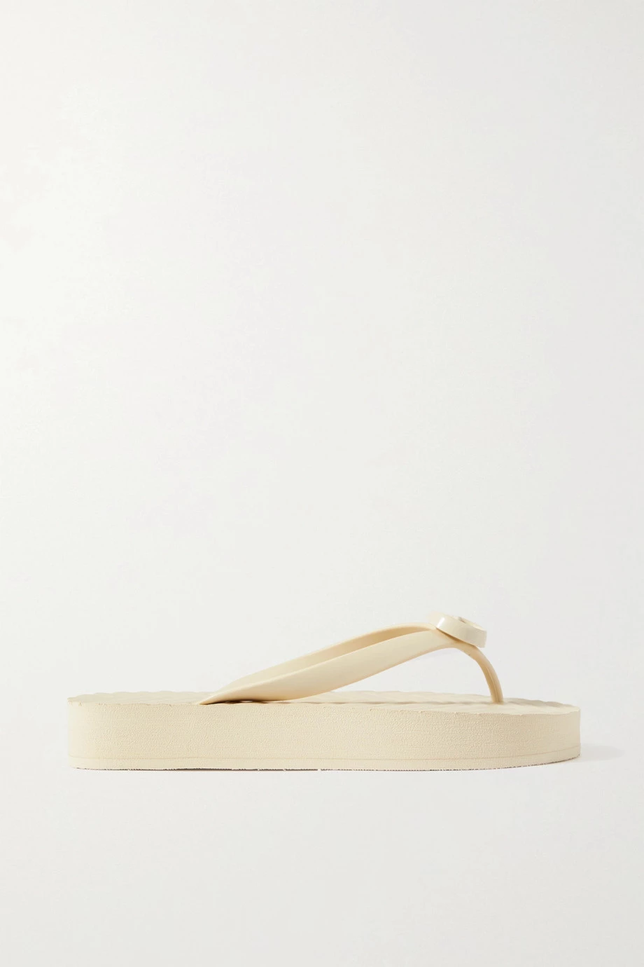 Die geprägte Innensohle der „Pascar“ Zehensandalen von Gucci erinnert an das zickzackförmige Steppmuster, das man von den „GG Marmont“ Taschen und Accessoires der Marke kennt. Das Paar aus Gummi wirkt aufgrund des Plateaus wie ein 90er-Jahre-Modell und hat eine Logoverzierung in Form der Initialen des Hauses, die aus glänzendem Harz besteht. Es passt genauso gut zu abgeschnittenen Jeansshorts wie zu Midikleidern.