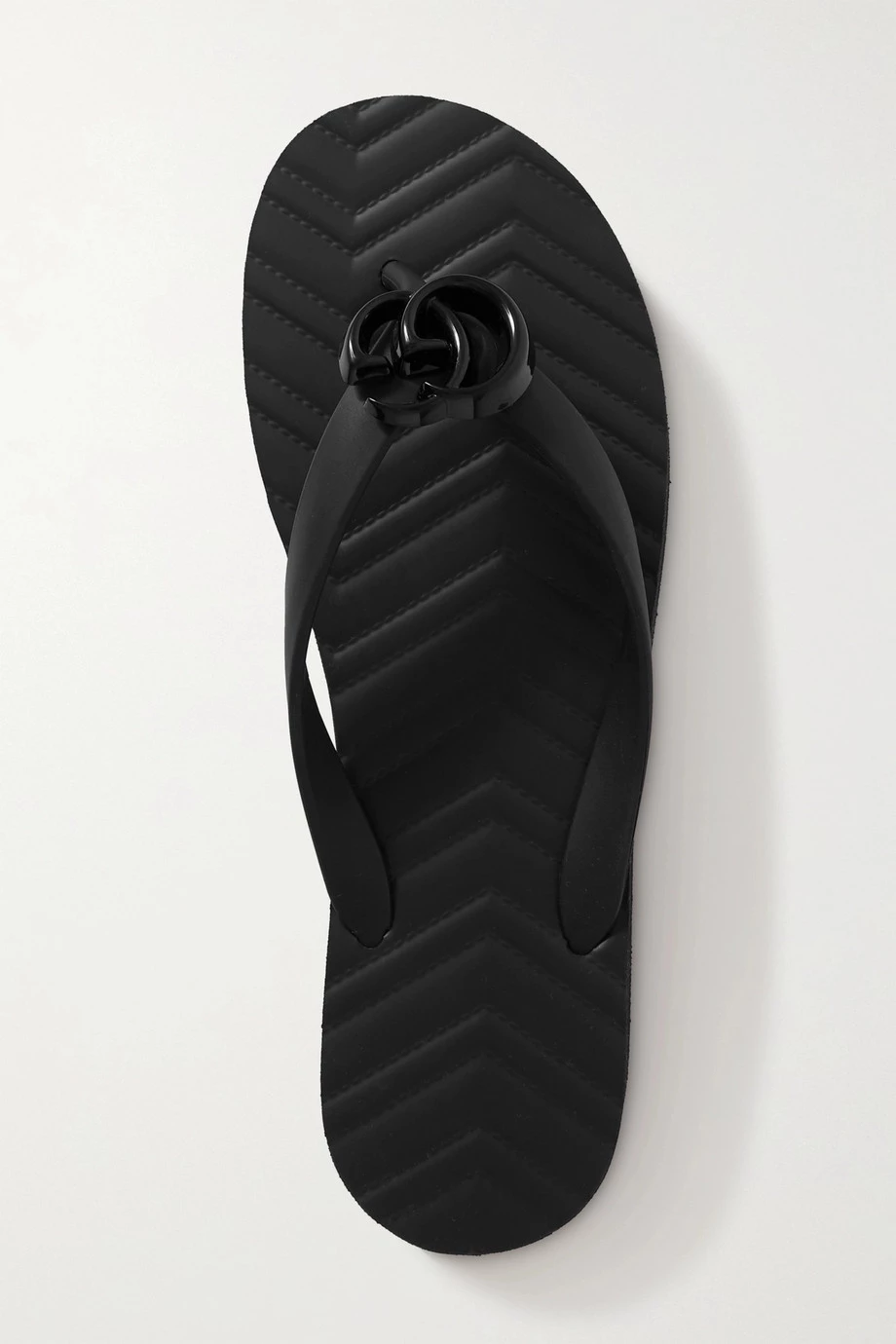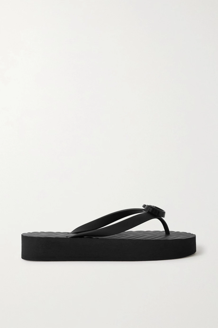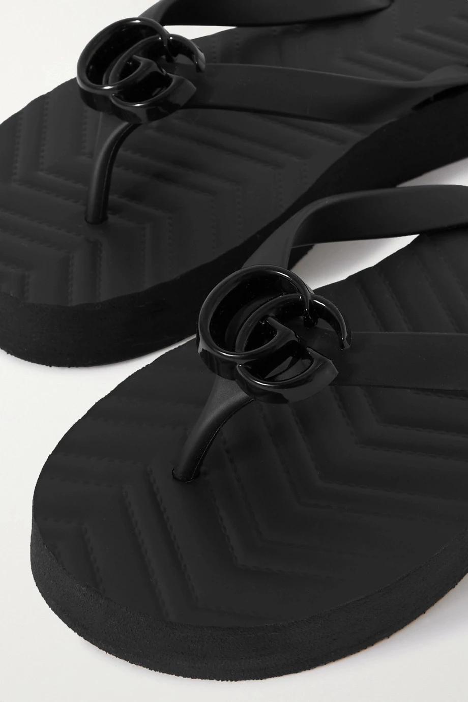 Die geprägte Innensohle der „Pascar“ Zehensandalen von Gucci erinnert an das zickzackförmige Steppmuster, das man von den „GG Marmont“ Taschen der Marke kennt. Das Paar aus Gummi wirkt aufgrund des Plateaus wie ein 90er-Jahre-Modell und hat eine Logoverzierung in Form der Initialen des Hauses, die aus glänzendem schwarzem Harz besteht. Es passt sowohl zu abgeschnittenen Jeansshorts als auch zu Midikleidern.