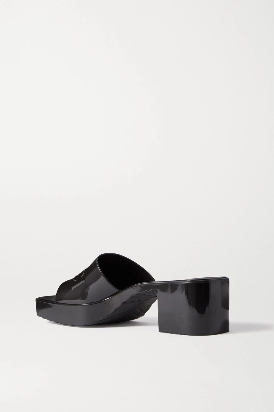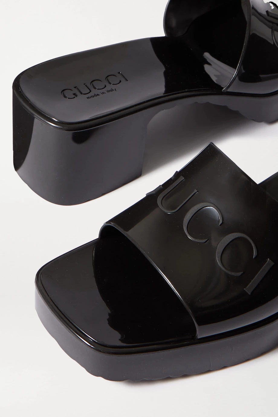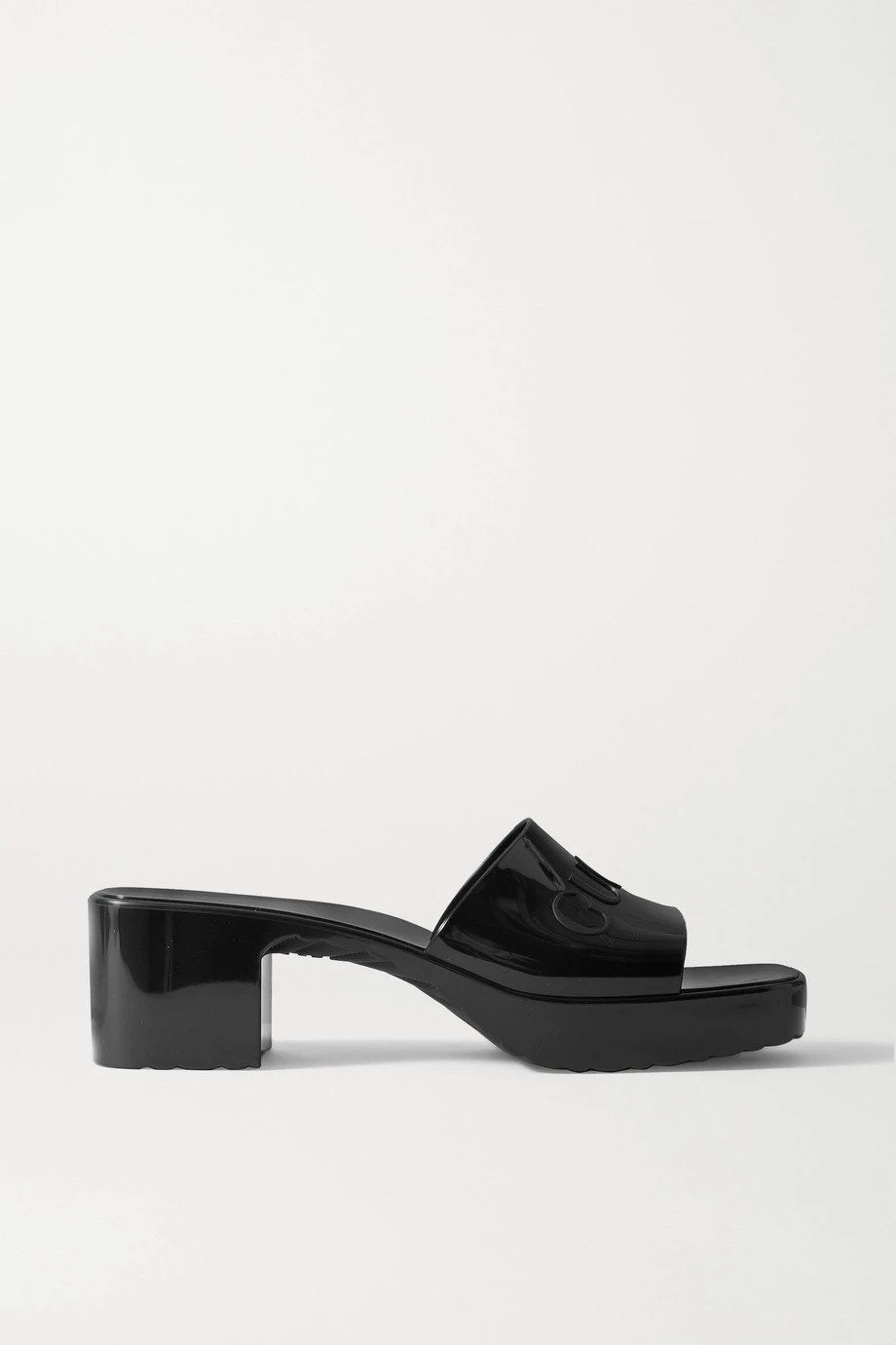 Die „Plastique“ Mules von Gucci versetzen uns in die glamourösen 90er-Jahre zurück. Das Paar wurde in Italien aus glänzendem Gummi mit Logoprägung gefertigt und zeigt sich mit einer karreeförmigen Zehenpartie sowie einem Blockabsatz mit Profil von 30 Millimetern Höhe. Es passt zu schicken Ensembles ebenso gut wie zu verkürzten Jeans mit Fransen.
