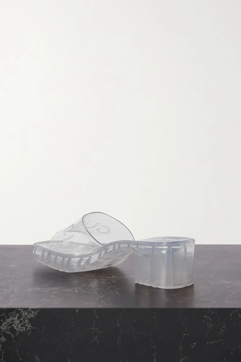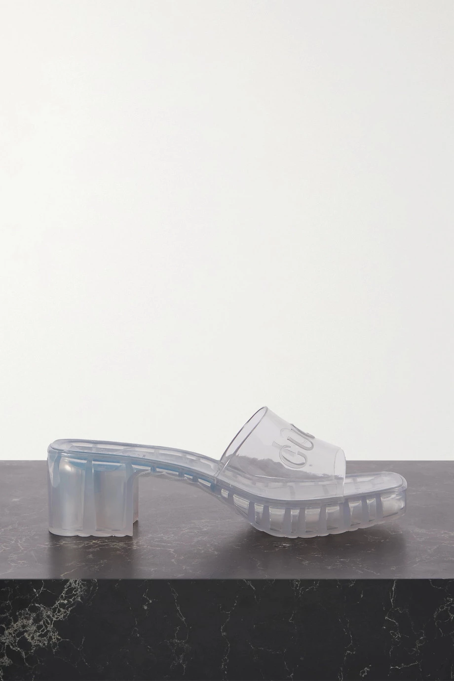 Die „Plastique“ Mules von Gucci versetzen uns in die 90er-Jahre zurück. Das Paar wurde in Italien aus farblosem Gummi mit Logoprägung gefertigt und zeigt sich mit einer karreeförmigen Zehenpartie sowie einem Blockabsatz. Es passt zu schicken Ensembles ebenso gut wie zu verkürzten Jeans mit Fransen.