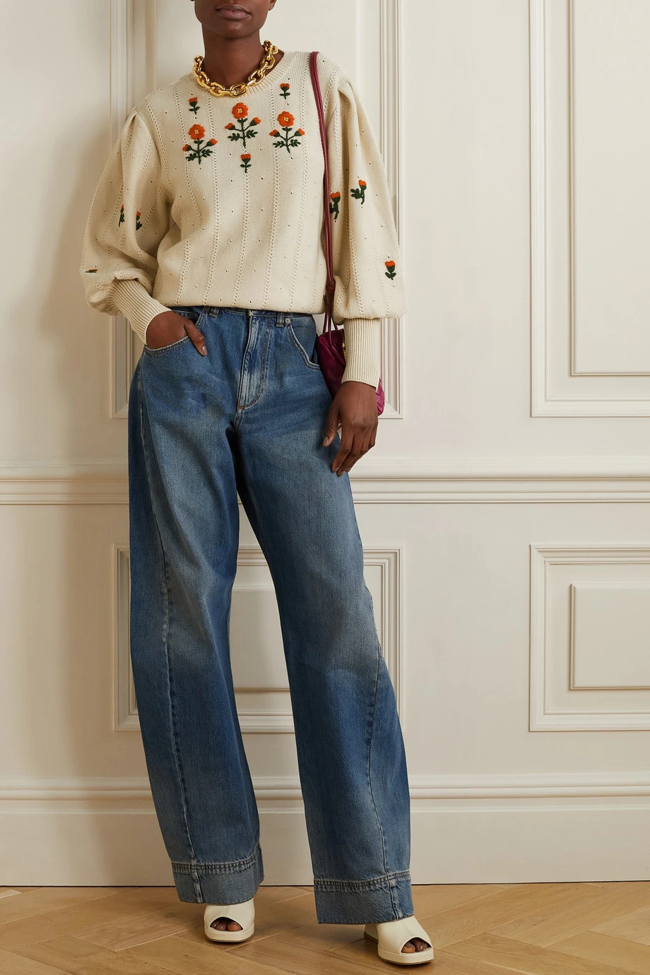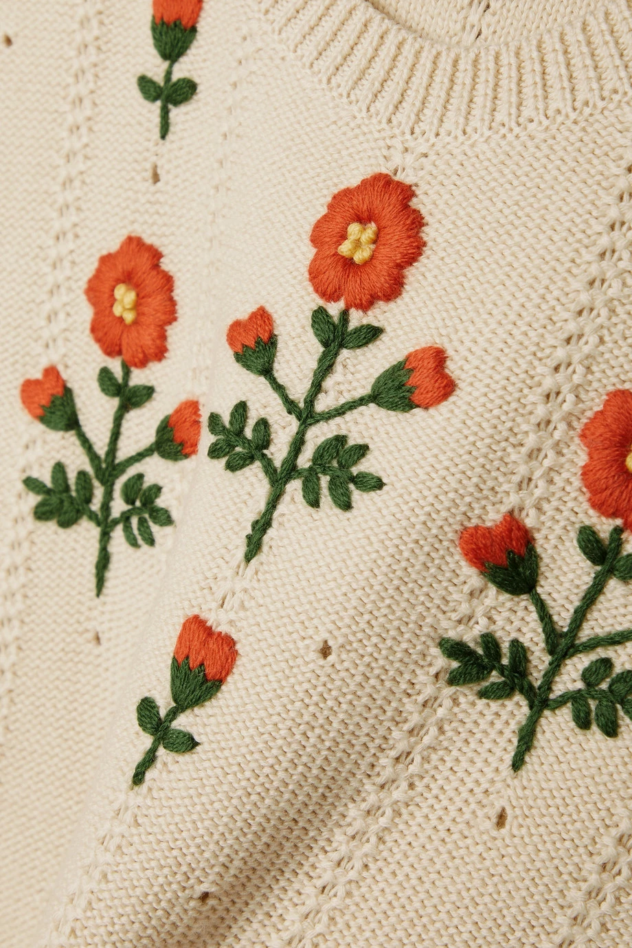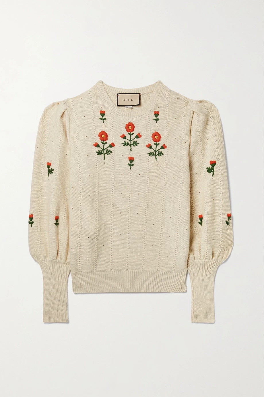Dieser Pullover von Gucci ist mit markanten Blumenmotiven bestickt, dank derer er wie ein Vintage-Original wirkt. Das lockere Modell wurde in Italien aus einer Woll-Baumwollmischung gefertigt und zeichnet sich neben dezenten Details in Pointelle-Strick auch durch betont voluminöse Ärmel mit breiten, gerippten Bündchen aus.