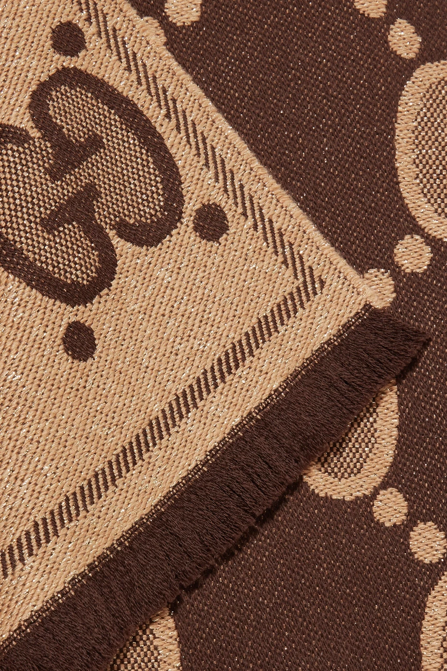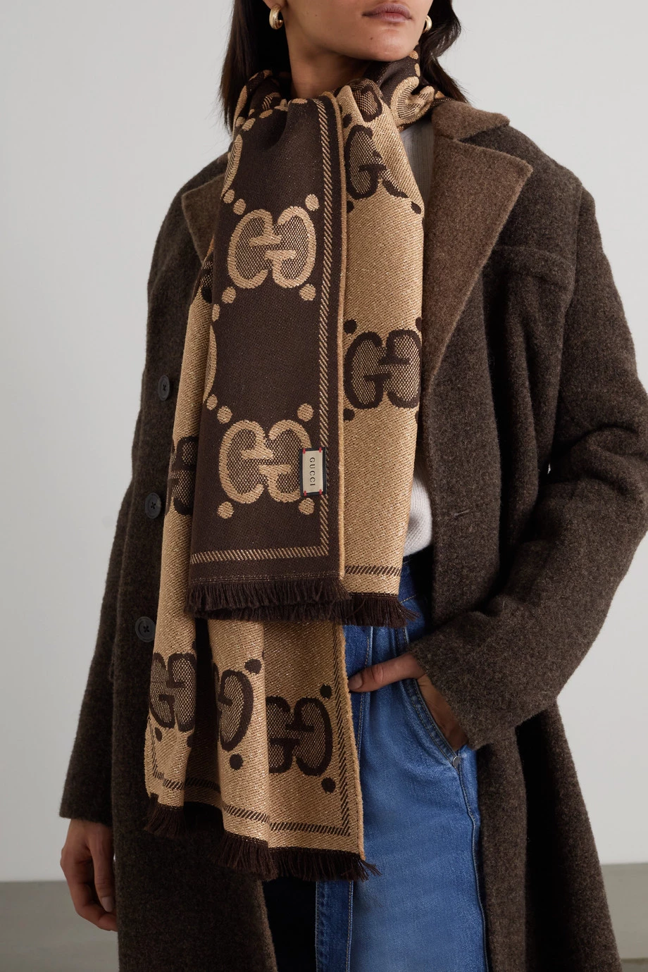 Dieser Schal von Gucci wurde in Italien aus einer weichen Wollmischung mit eingearbeiteten Metallic-Fasern gefertigt und mit dem unverkennbaren „GG“-Logo gestaltet. Legen Sie das Accessoire über das Revers Ihres Mantels.