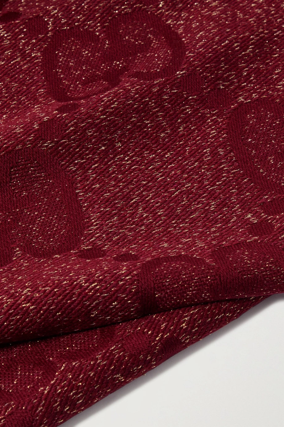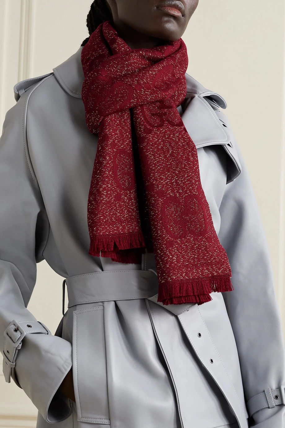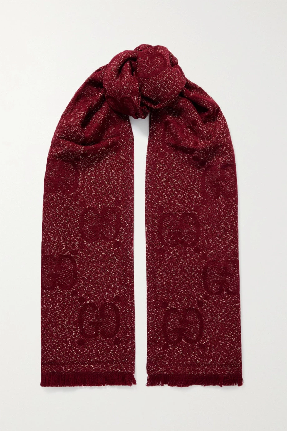 Dieser Schal von Gucci wurde in Italien aus einer weichen Wollmischung mit eingearbeiteten Metallic-Fasern gefertigt und mit dem unverkennbaren „GG“-Logo gestaltet. Legen Sie das Accessoire über das Revers Ihres Mantels.