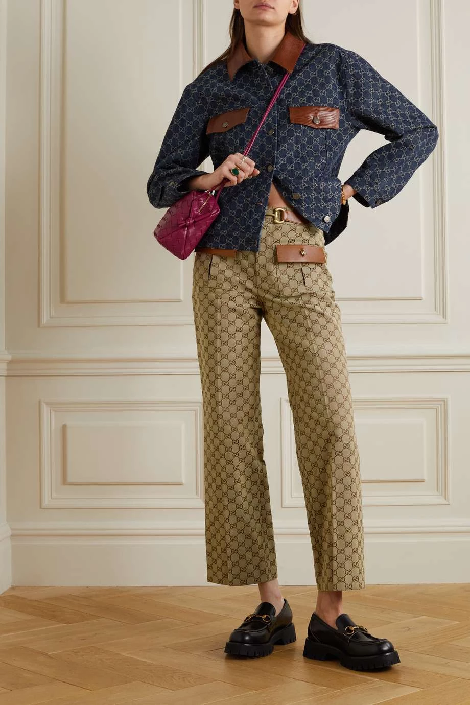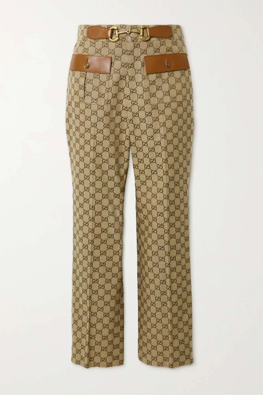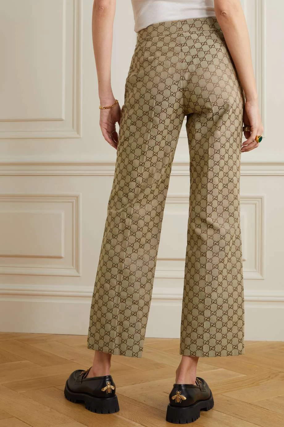 Diese verkürzte Hose von Gucci zeigt sich mit zahlreichen markentypischen Designelementen: vom „Horsebit“-Detail bis hin zu den Knöpfen und dem Jacquard-Muster mit ikonischem „GG“-Logo. Das Modell wurde in Italien aus Canvas aus einer Baumwollmischung gefertigt und am ausgestellten Bein mit Bügelfalten gestaltet. Zudem hat es Besätze aus geschmeidigem Leder und gefällt uns mit einer weißen Bluse und einem Paar Loafers des Hauses besonders gut.