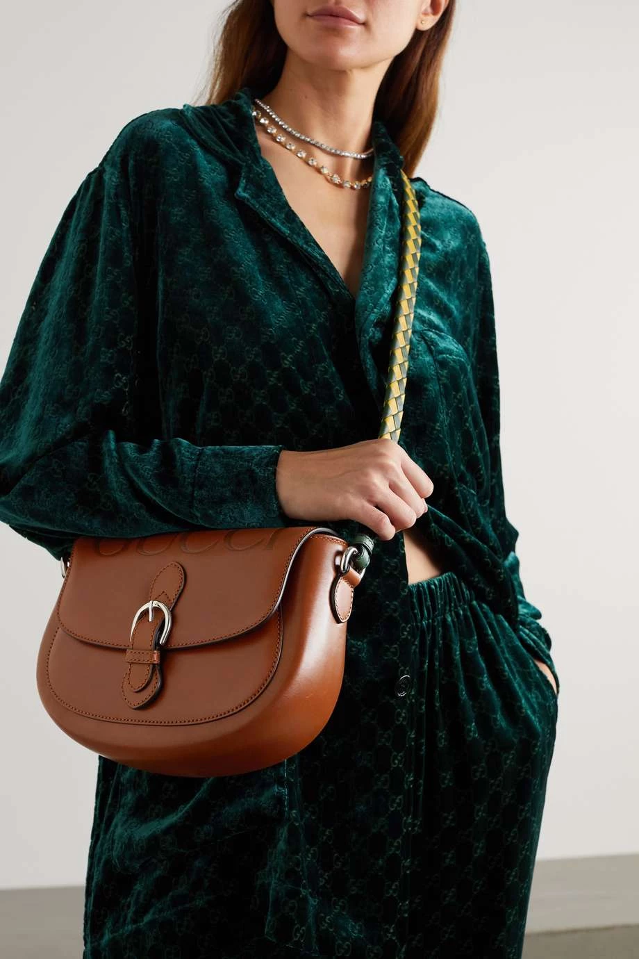 Inspiration für die F/S 22-Kollektion von Gucci fand Alessandro Michele in der 100-jährigen Geschichte des Hauses – diese Tasche beispielsweise greift die frühen Bezüge zum Reitsportstil auf. Das klassische Sattelmodell wurde aus Leder gefertigt, mit dem Markennamen geprägt und mit einem farbenfrohen geflochtenen Schulterriemen ausgestattet.