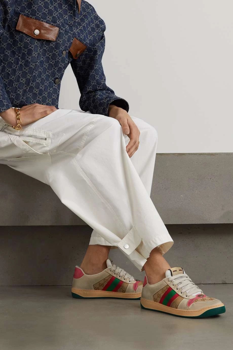 Damit die „Screener“ Sneakers von Gucci wie ein gern getragenes Retro-Paar wirken, wurde das Leder mit Distressed-Details versehen. Das in Italien gefertigte Modell hat eine praktische genoppte Gummisohle und Canvas-Partien mit Logomuster; zudem ist es mit dem markentypischen Webstreifen verziert. Wenn Sie gerne Farbe in Ihre Outfits bringen, dann tauschen Sie die Schnürsenkel in Creme gegen jene in Pink aus.