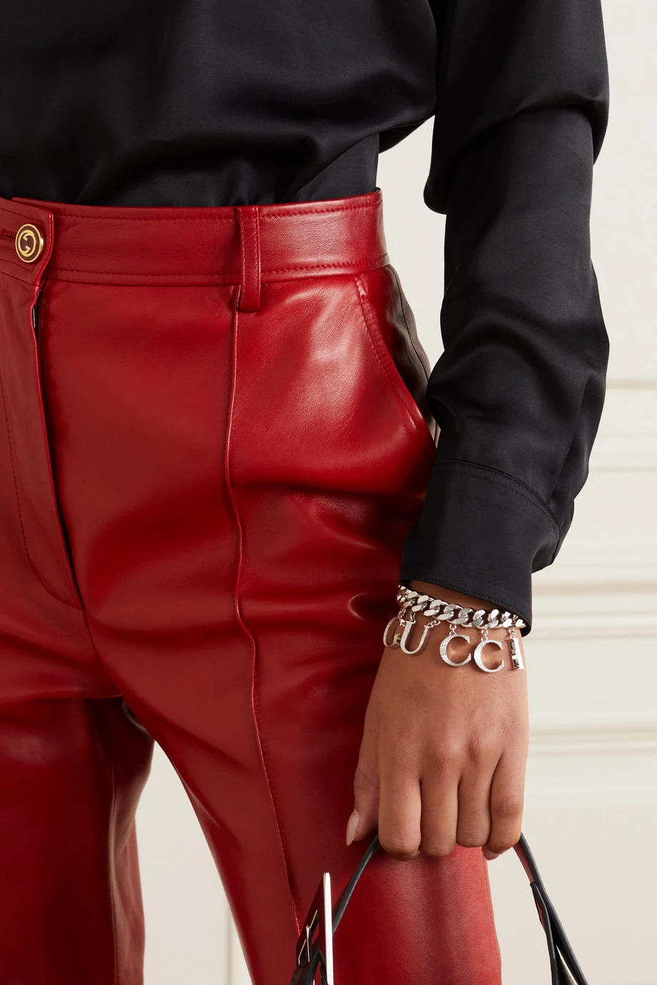 Dieses silberfarbene Armband von Gucci ist mit großen Buchstaben verziert, die den Namen des Hauses bilden – jene baumeln an markanten flachen Gliedern, deren eingraviertes Schlangenmuster auch an den einzelnen Anhängern zu sehen ist. Der Achterverschluss zeigt sich in Form des ineinandergreifenden „GG“-Emblems.
