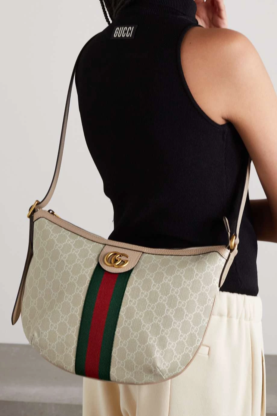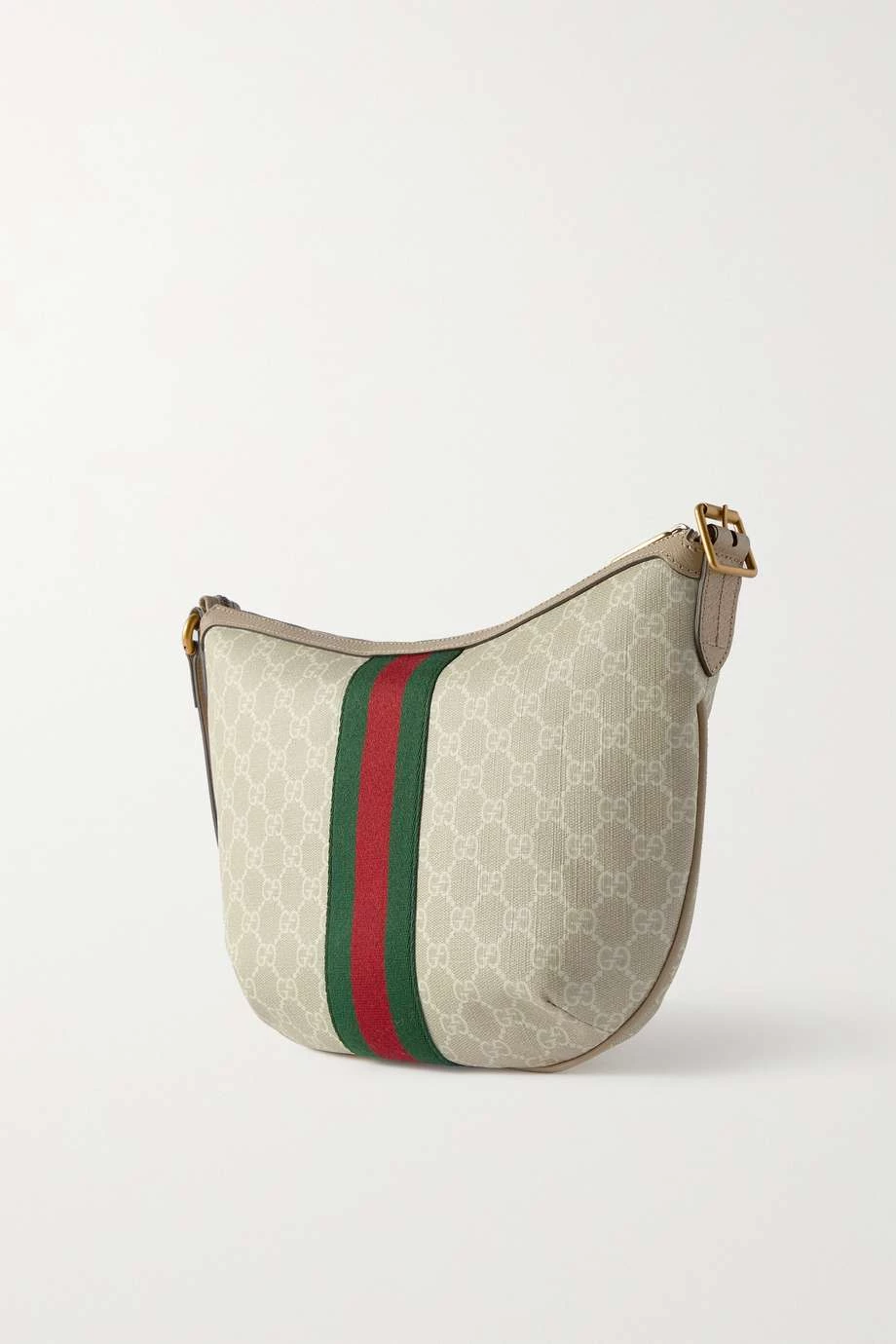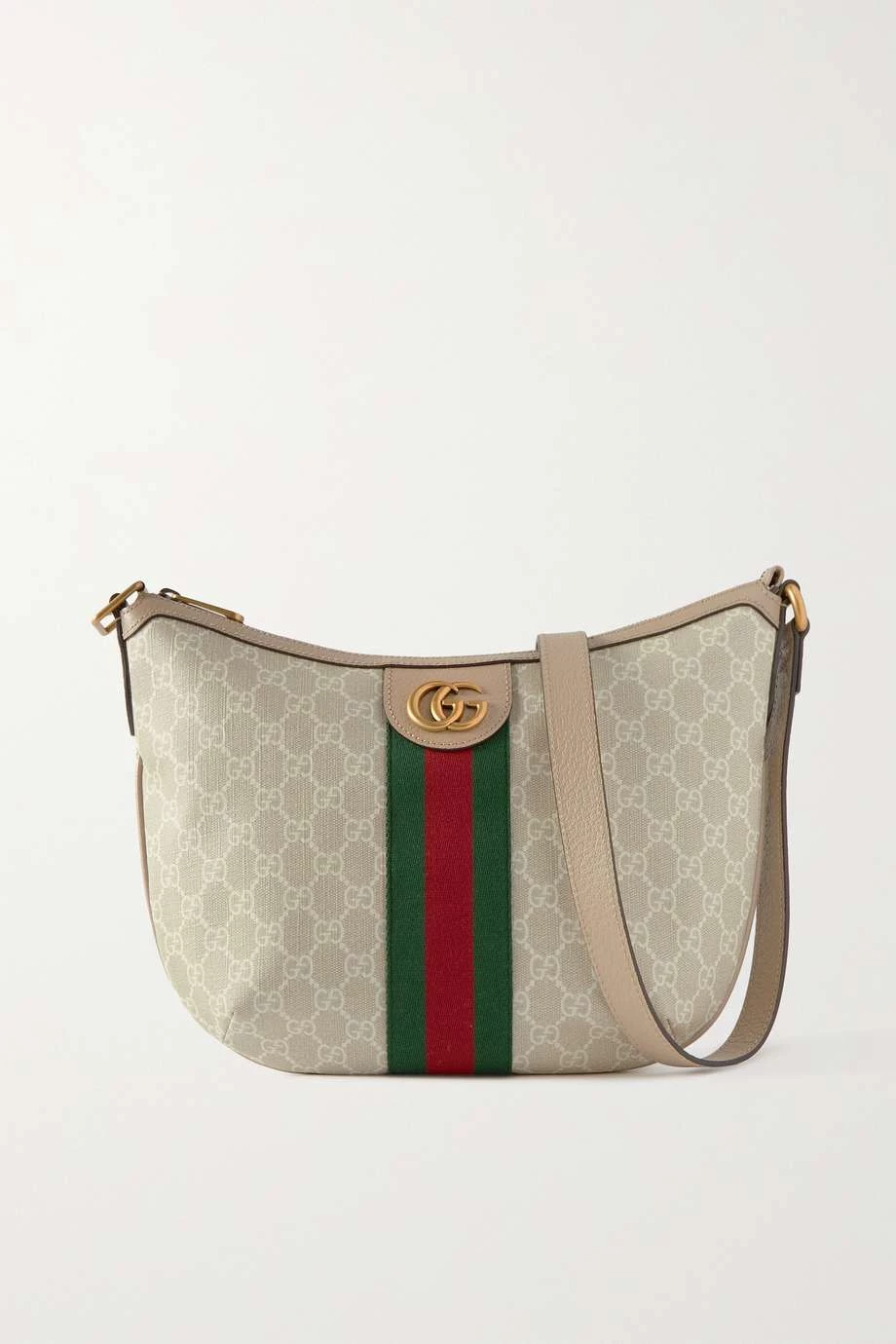 Diese Tasche von Gucci besteht aus dem charakteristischen beschichteten Canvas mit „GG Supreme“-Logomuster, der in Anlehnung an ein Archivmaterial aus den 30er-Jahren entstand. Das Modell zeigt sich zudem mit einem markentypischen Webstreifen in Grün und Rot sowie goldfarbenen Details in Vintage-Optik. Wir tragen das Accessoire wahlweise auf der Schulter oder crossbody.