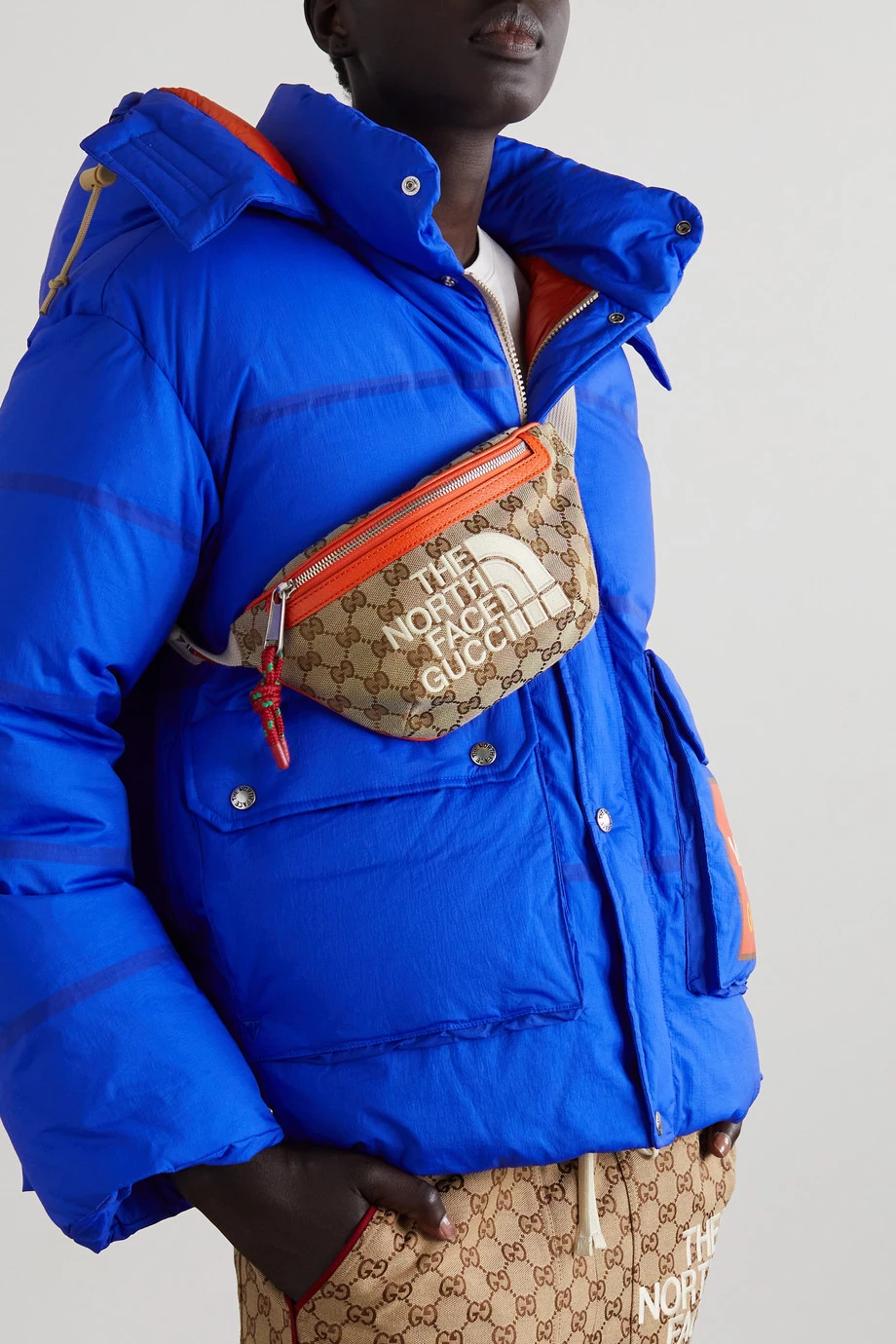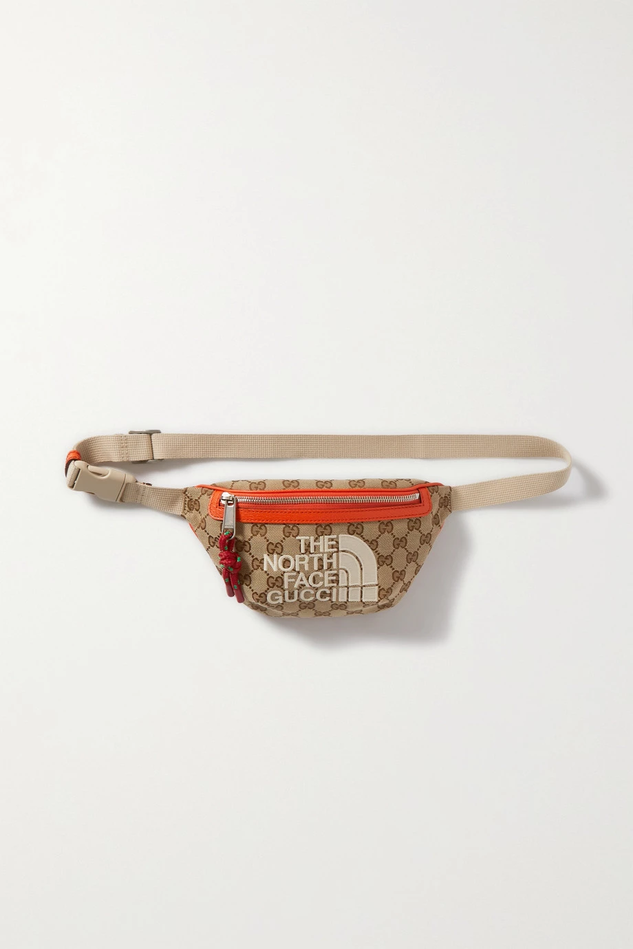 Gucci hat sich mit The North Face zusammengetan und erneut eine besonders begehrte Kollektion kreiert. Diese Gürteltasche aus beschichtetem Canvas mit Jacquard-Muster aus Monogrammmotiven zeigt sich mit orangefarbenen Lederbesätzen und einem Reißverschluss an der Vorderseite. Der Riemen lässt sich verstellen, weshalb man das Accessoire nicht nur um die Taille, sondern auch an der Schulter tragen kann.