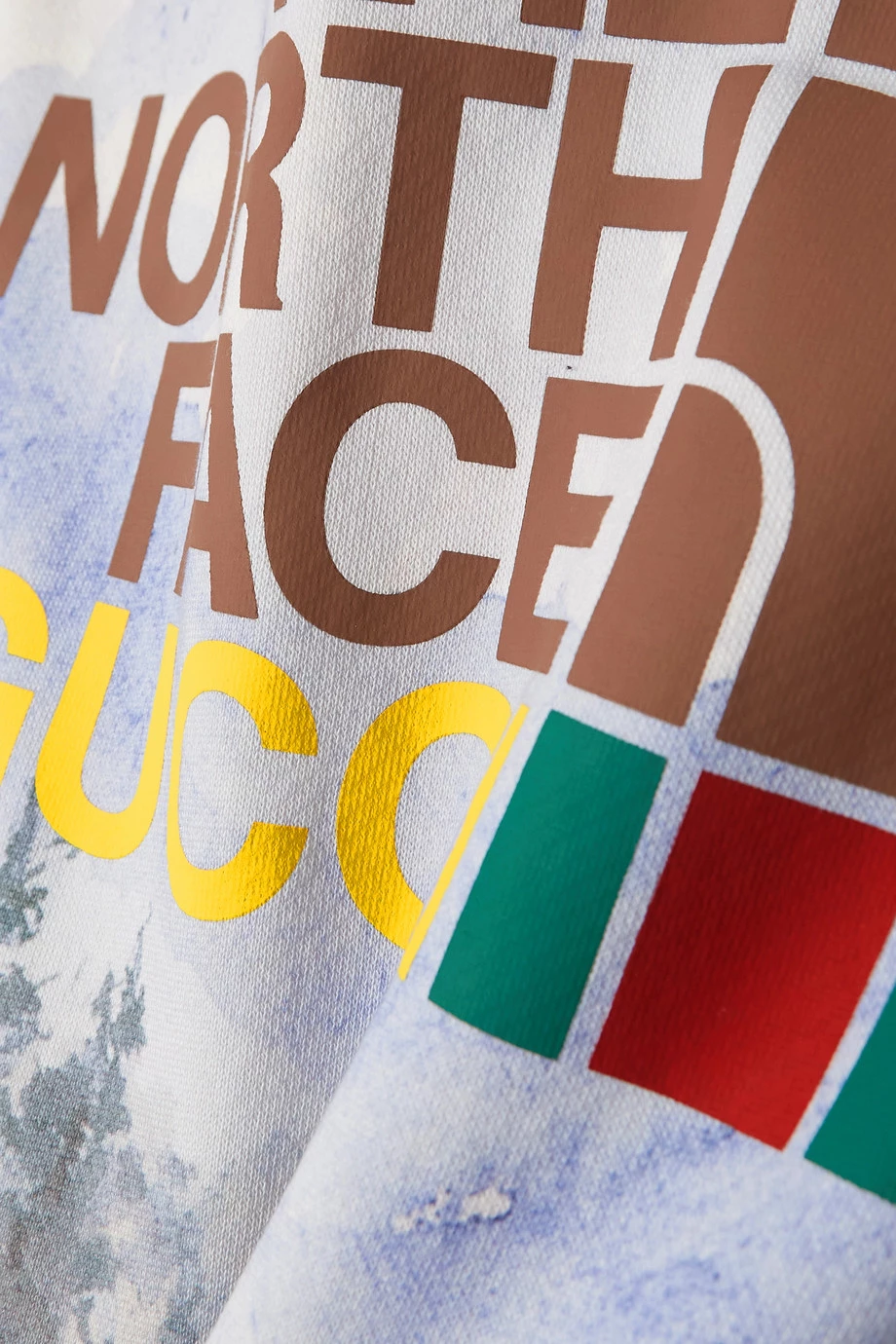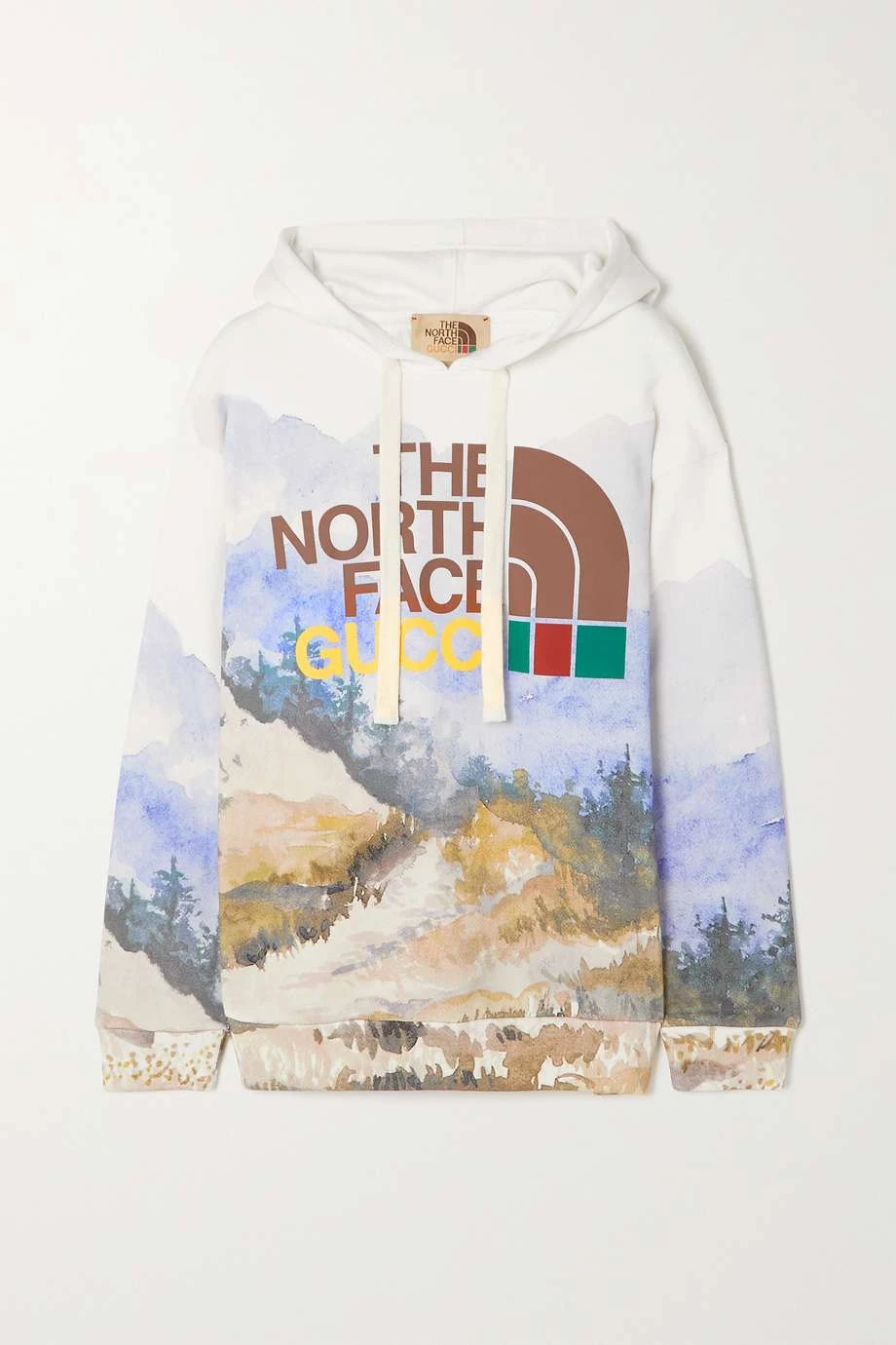 Dieser Hoodie entstammt einer begehrten Kollektion, die in Zusammenarbeit von Gucci + The North Face entstanden ist. Die beiden Marken haben mit jener Reihe eine Hommage auf die Abenteuerlust geschaffen, was man auch an diesem Hoodie erkennen kann. Das Modell zeigt sich neben einem Print in Form einer malerischen Berglandschaft auch mit den „Web Stripe“- und „Dome“-Motiven.