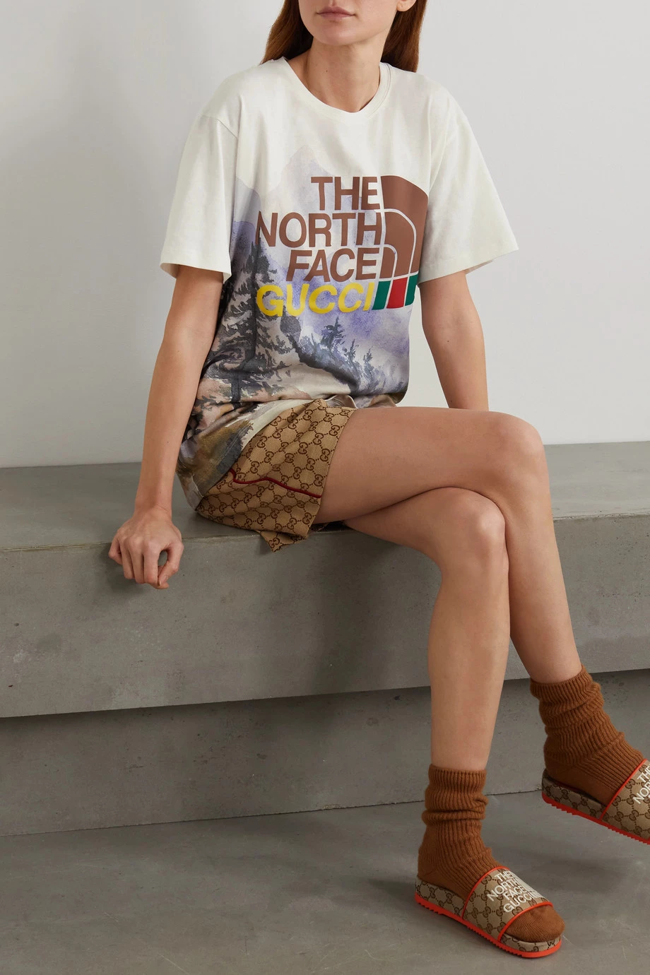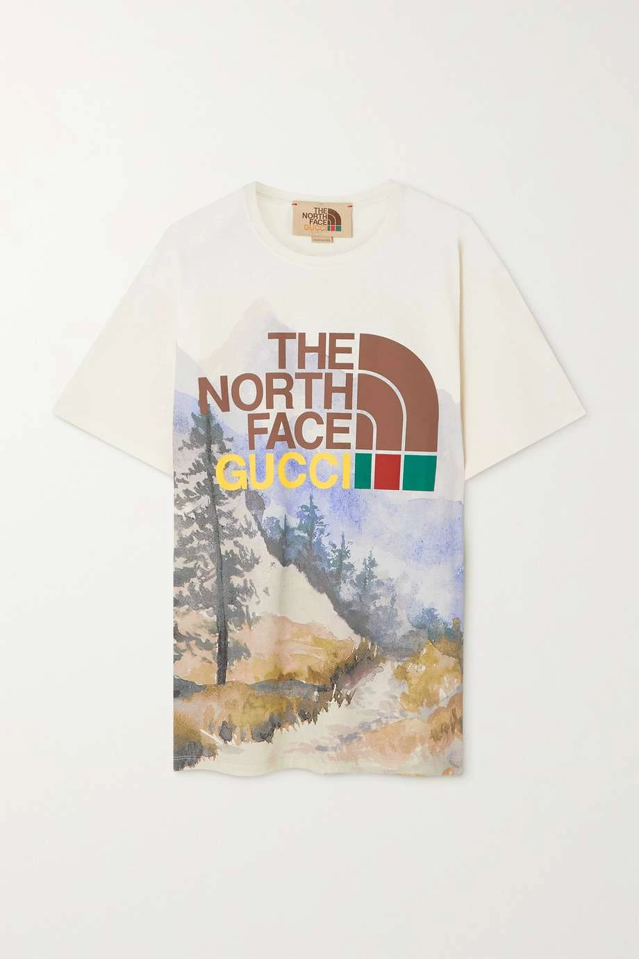 Die Kollaboration von Gucci und The North Face verbindet Charakteristika beider Marken. Dieses leicht lockere T-Shirt, das Abenteuerlust symbolisiert, besteht aus Baumwoll-Jersey und ist mit einem Waldmotiv bedruckt. Zudem zeigt es sich mit den Logos beider Häuser.