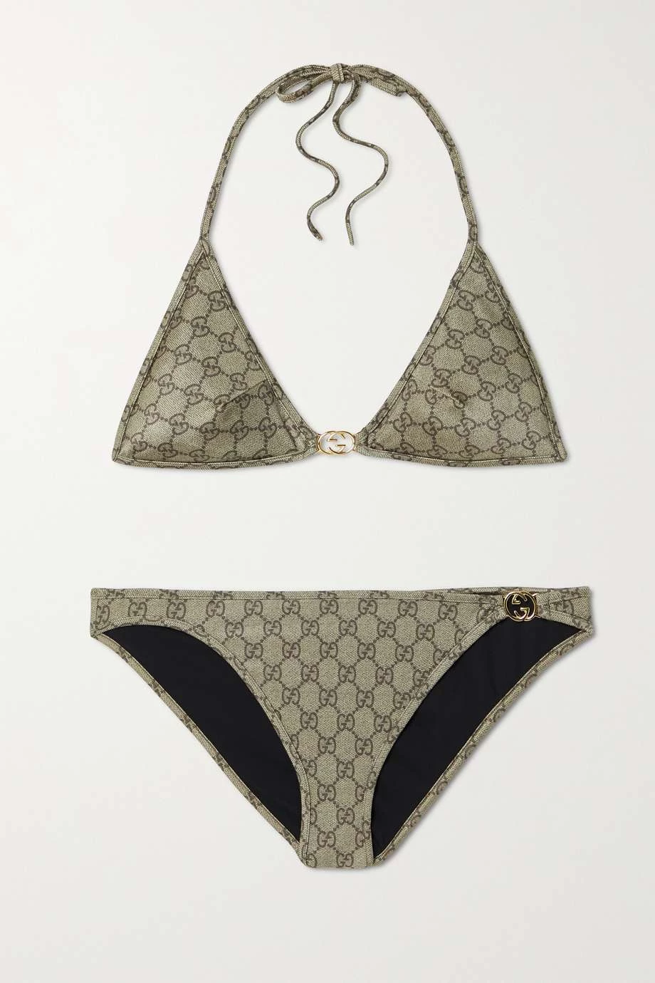 Der „Love Parade“ Bikini von Gucci gehört in absolut jeden Urlaubskoffer: Dank des ikonischen „GG“-Musters und der abgestimmten goldfarbenen Details ist er ein echter Hingucker. Das Modell aus glattem Stretch-Material in schimmernder Metallic-Optik wurde mit verstellbaren Trägern gestaltet. Tragen Sie eine getönte Sonnencreme dazu und schlüpfen Sie in Ihre Lieblingspantoletten.