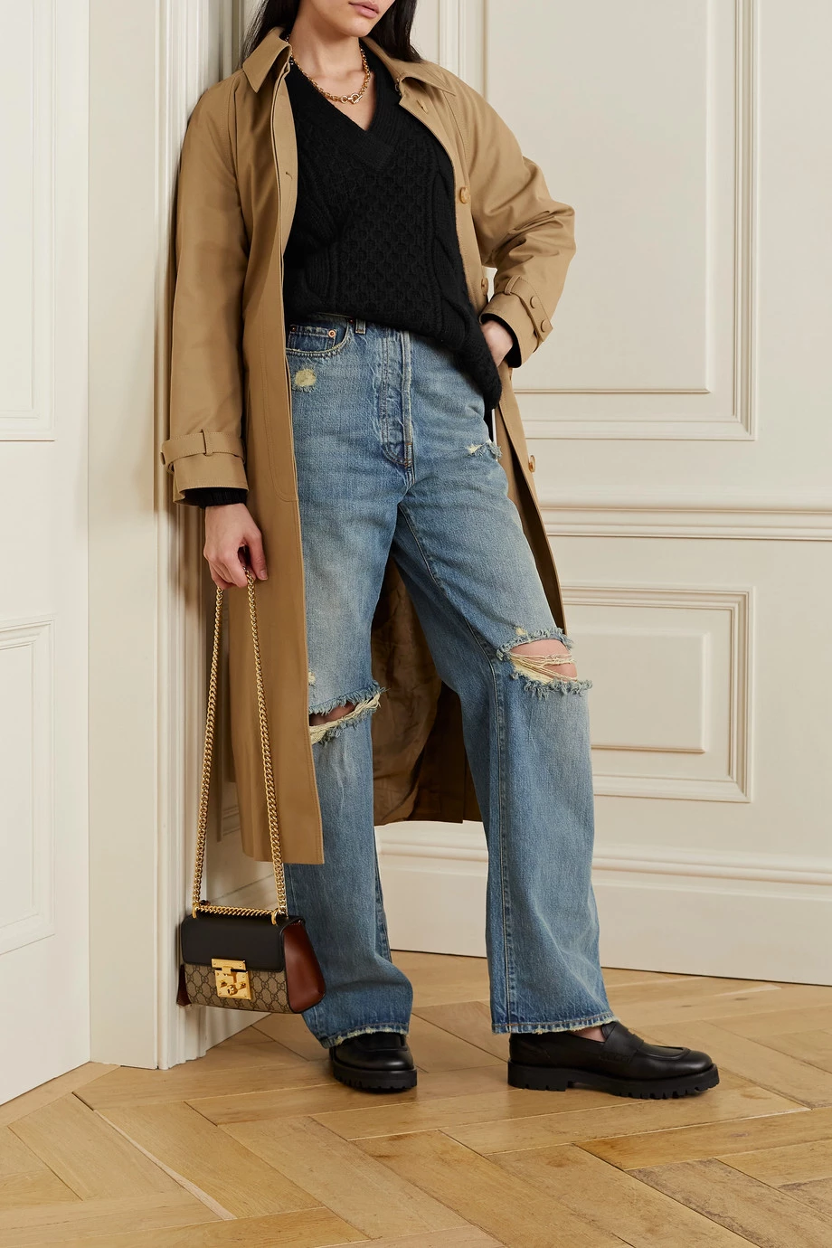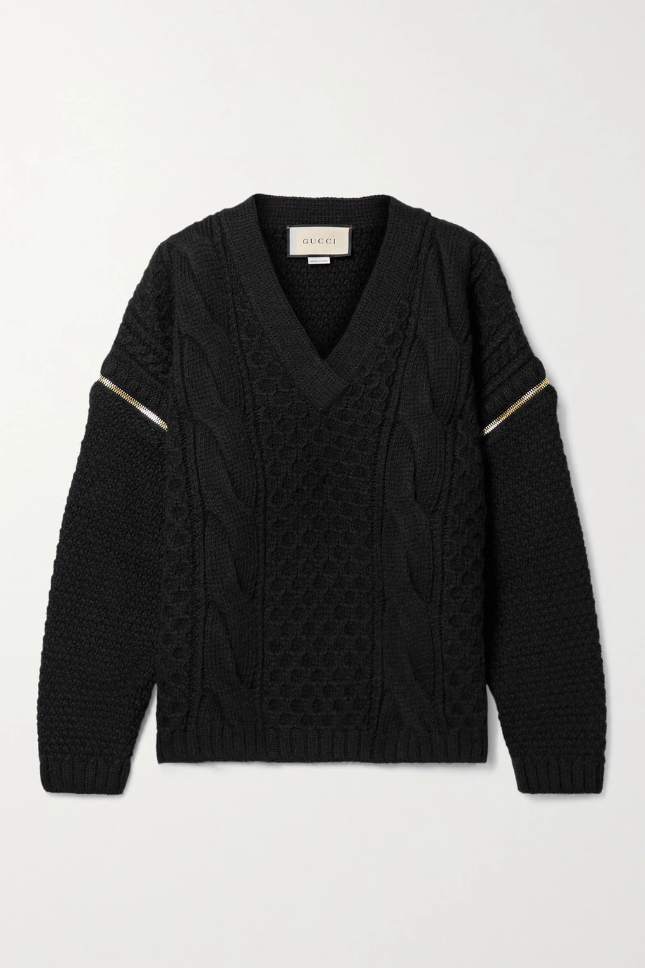 Dieser Pullover in Zopfstrick von Gucci hat Ärmel, die Sie dank der Reißverschlüsse abnehmen und das Modell so in einen Pullunder verwandeln können. Es wurde in Italien aus warmer Wolle gefertigt und zeigt sich mit einer leicht lockeren Form mit vorteilhaftem V-Ausschnitt. Jeans in Distressed-Optik passen ebenso gut dazu wie gemusterte Röcke.