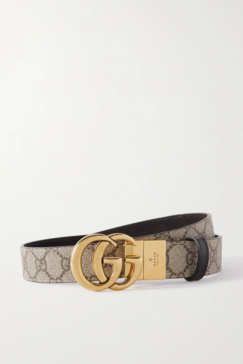 Dieser Gürtel von Gucci ist wendbar, weshalb Sie ihn doppelt so oft tragen werden. Das in Italien gefertigte Accessoire hat eine Seite aus geschmeidigem Leder und eine aus beschichtetem Canvas mit einem Muster aus dem Monogrammlogo der Marke. Den Abschluss bildet eine Schnalle in Form des ikonischen „GG“-Details.